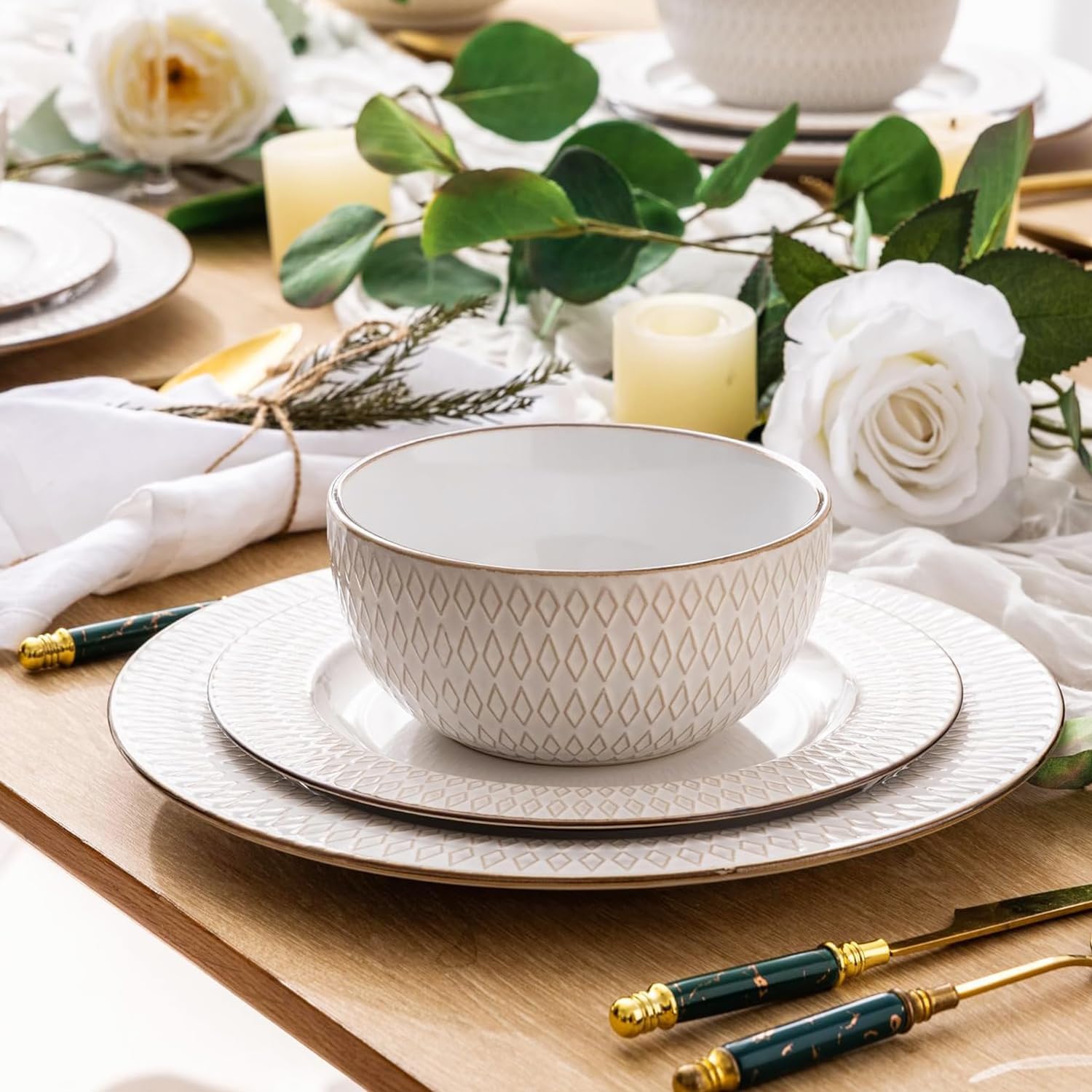 - UNIQUE MODERN DESIGN: Our 12-piece ceramic dinnerware set features a modern and elegant embossment design, allowing your dinner plate and bowl to be the star of the table. The glaze is pure snow-white with light embossment, and darkened rims, which look ultra classy and beautiful. This white dinnerware set is durable enough for everyday use for the family, yet sophisticated enough for that important dinner party or special event. Perfect for wedding and housewarming gifts.