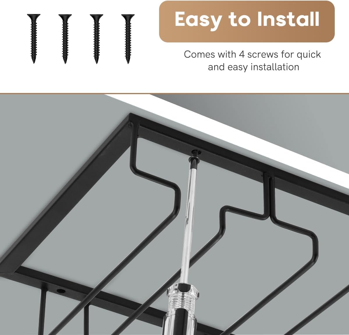 - [Easy to install] - This wine glass hanging rack comes with pre-drilled mounting holes and the screws needed.This rack just takes you a few minutes to assemble and it is easy .What you need to do is using a screwdriver to tighten the screws into the bottom of the wooden cabinet.Ideal for DIY making a wine bar at home or kitchen.