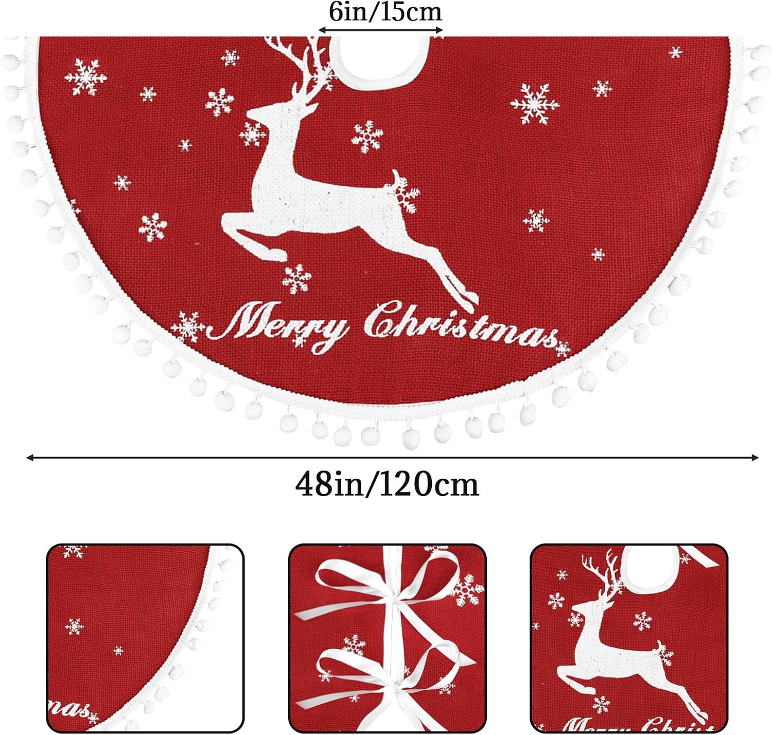 - Merry Christmas Tree Skirt:Our Christmas tree skirts is printed with elk and various sizes of snow patterns, as well as the words "Merry Christmas." The edges are adorned with small, fluffy balls, adding a festive touch to your Christmas tree. This 48-inch tree skirt is perfectly sized for most Christmas trees perfectly. Before making a purchase, please measure the diameter of your tree to ensure a perfect fit