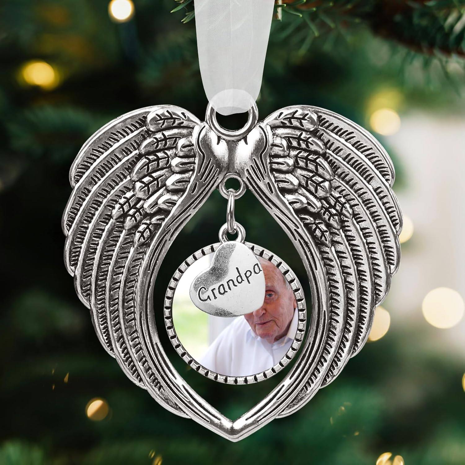 - This exquisite ornament allows you to personalize it with a cherished photo, creating a beautiful tribute to honor their memory.Crafted with attention to detail, these angel wings ornaments are delicately designed to bring comfort and solace during the holiday season