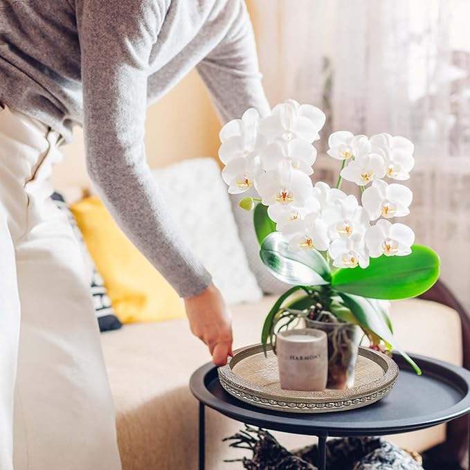 - [Unique Wood Grain]: Our round wood tray is made of premium natural pine wood,both durable sturdy and super lightweight,hard-wearing and serviceable for a long period to use. The wood trays home decor that come to you are unique.