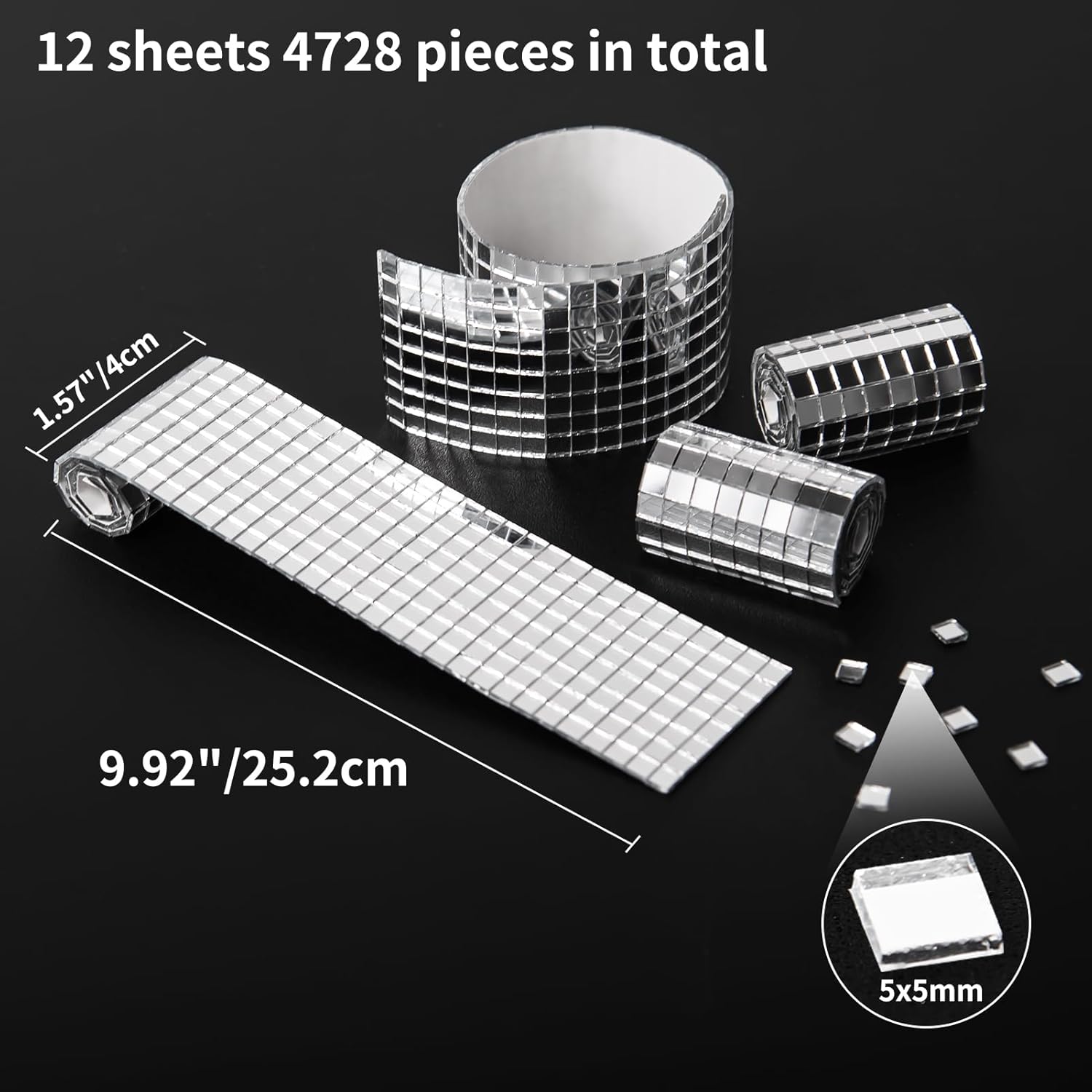 Art3dwallpanels 12 Pack Self-Adhesive Glass Mirror Mosaic Tiles 4728 Pieces Small Square Mirror Tiles Sticker for DIY Craft Decoration, Disco Ball Silver