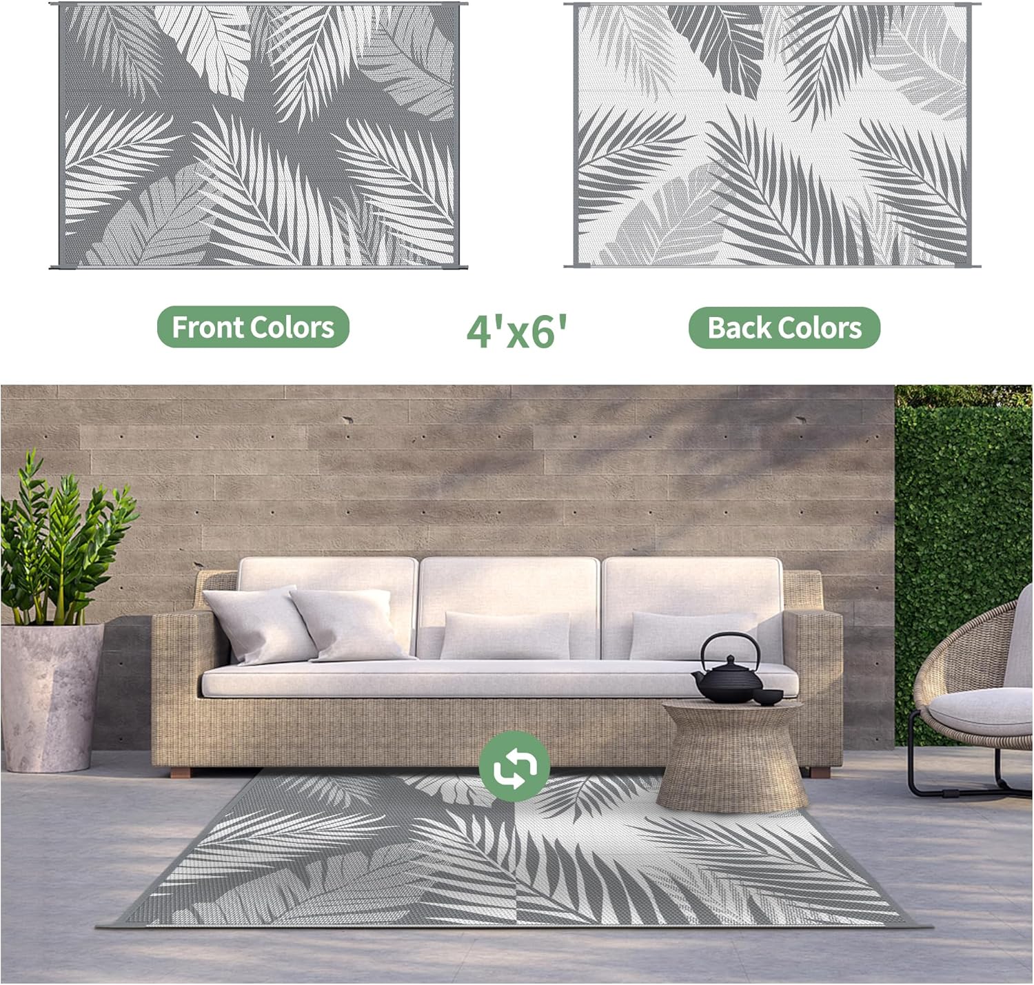 GENIMO Outdoor Rug 4' x 6' Waterproof for Patios Clearance, Reversible Outdoor Plastic Straw Camping Rug Carpet, Large Area Rugs Mats for RV, Camper, Deck, Balcony, Porch, Beach, Picnic, Grey&White