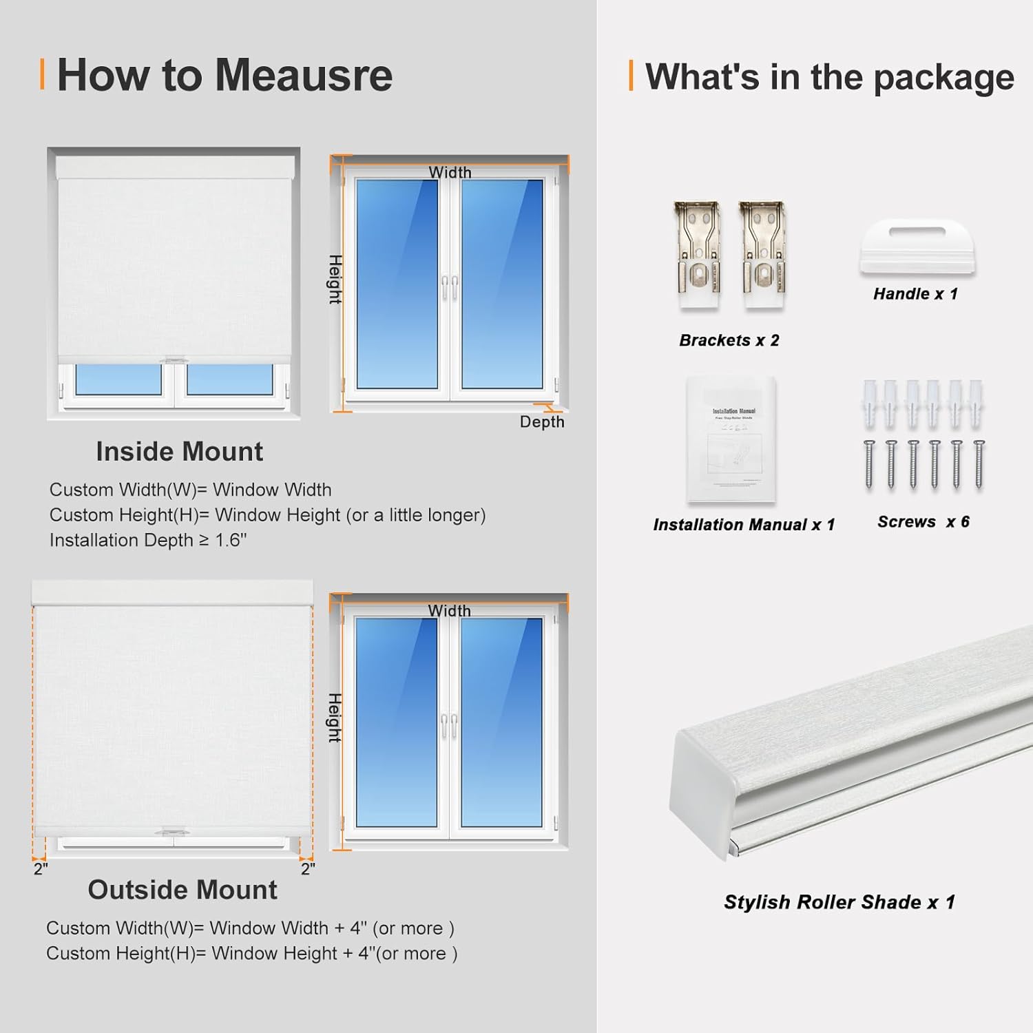 - [HOW TO CHOOSE THE CORRECT SIZE OF BLIND]: FOR INSIDE MOUNT: Choose the width of blind the same as the window, it is okay to choose a height slightly higher than the window. FOR OUTSIDE MOUNT: Based on the size of your window, we recommend you to plus at least 4" to its width and height, that is, add 2" on each side of the window. [PLS Note] Fabric width will be 0.94" shorter than the size of the shade.