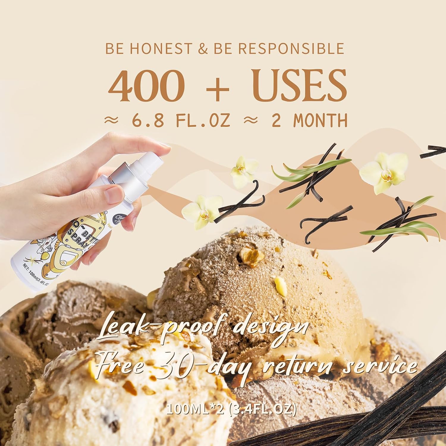 - LONG LASTING FRESHNESS: 2*3.4 FL.OZ ≈ Up to 400 Uses ≈ 2 Month for average poopers, all for lovely ones. Spray the surface of the toilet a few times to lock in the unpleasant smell, and no one else will ever know