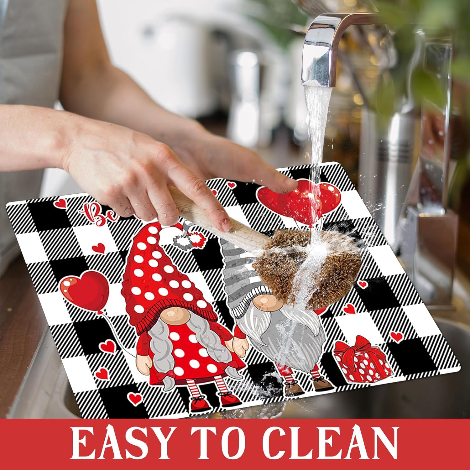 - 【High-quality Material】Our Valentine's Day gnomes dining table placemats are crafted from high-quality plastic, can be used repeatedly for a long time. These buffalo plaid table mats are waterproof and heatproof, providing reliable protection against spills and hot dishes, they are also odorless and non-toxic, creating a safe dining environment for you and your loved ones.