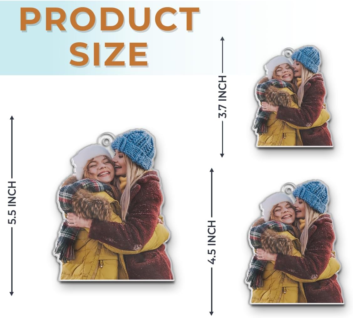 - ๐ Custom Ornaments With Pictures: Crafted with high-quality acrylic, this ornament features a height of 3.7 inches (~9.5 cm) and a slim 0.12" thickness, ensuring its durability and lightweight design. The ornament can be customized with your photo, which makes it a truly personal and cherished gift. We include a hanging gold cord loop to easily hang on your Christmas tree or an ornament stand.