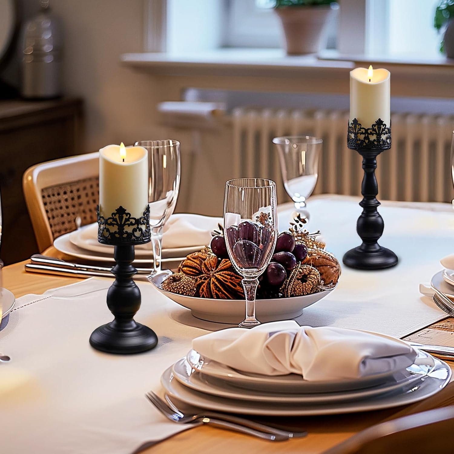 - 【Material】: The pillar candle holder is made of high-quality iron and is light but strong. The surface is black and will last for years. Metal candle holders set of 2 can hold real candles or LED candles.