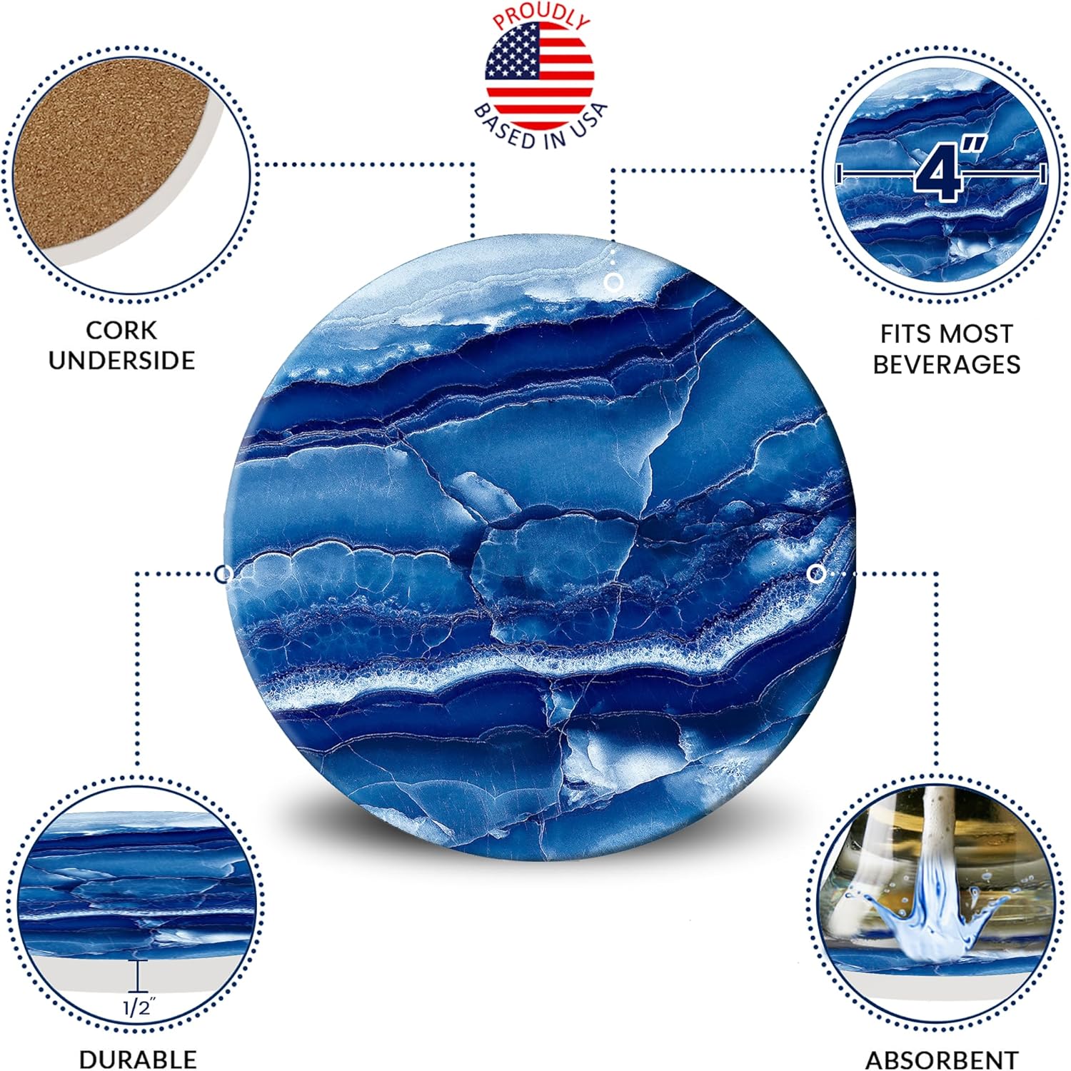 - FULL COMPREHENSIVE PROTECTION: The stone coasters feature non-slip durable cork backing to protect countertops and desks from scratches even from thirsty drinkers! The non-sticky corked backing base helps the coasters stay in place and prevents scratching your glass or wooden countertop tables.