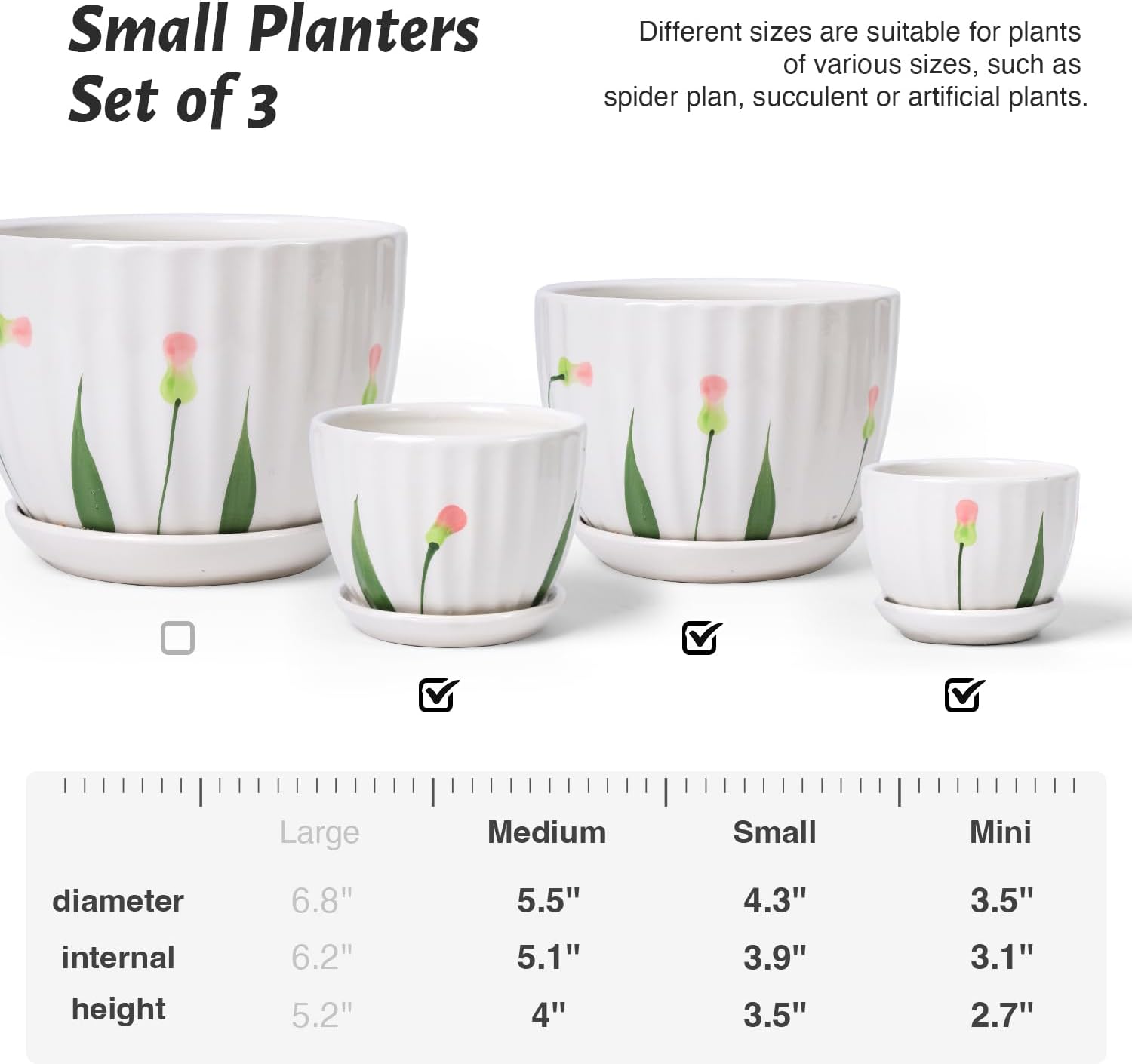 - SMALL PLANTER SET: These garden plant pots are made of ceramic and come in three sizes: Medium width is 5.5 inches (14 cm), Small width is 4.3 (11 cm) inches, and nimi width is 3.3 inches (9 cm). They are fired at high temperature, so they are durable and lightweight.