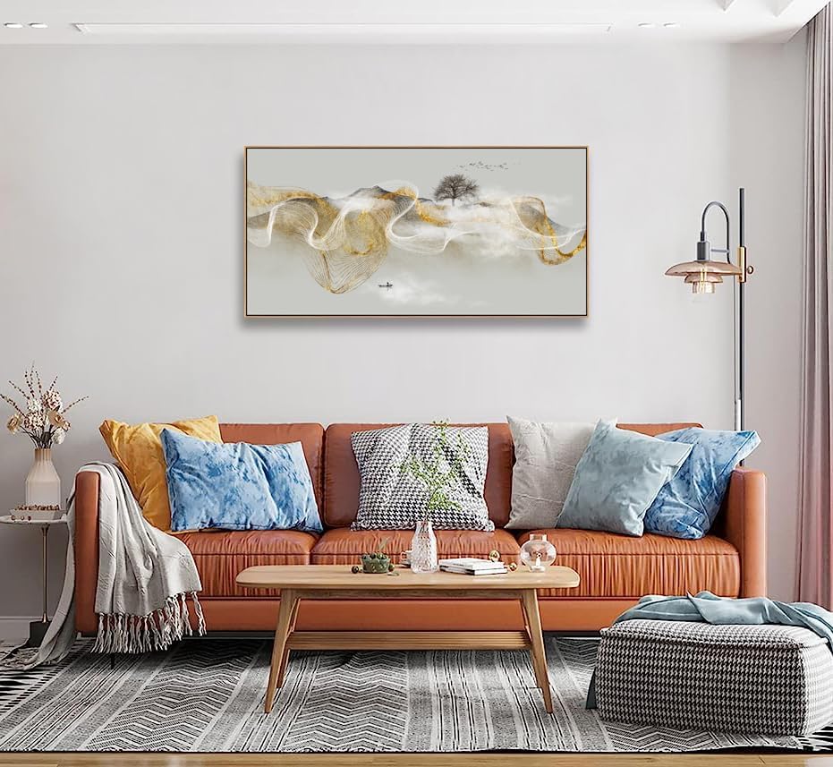 HUADAOART Wall Art Modern Zen Light Luxury Natural Landscape with Golden and White lines Background Wall Decor Canvas Prints for Living Room Bedroom 24x48 Inches (Framed)
