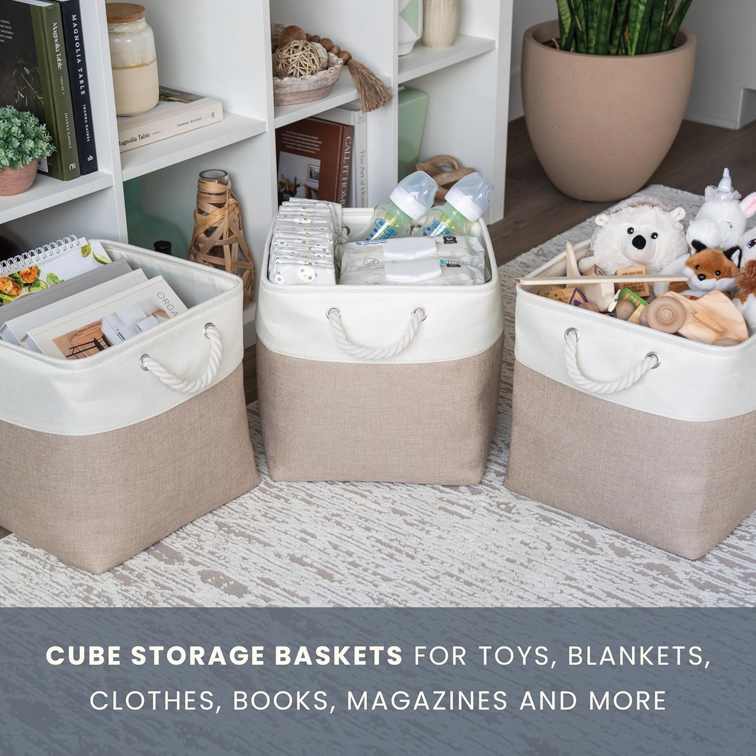 OrganiHaus 13x13 Cube Storage Bins 4 Pack, Foldable Cube Storage Organizer w/ Rope Handles, Collapsible Fabric Bins for Toys, Clothes & Closet Organization, Fabric Square Baskets - Beige/White