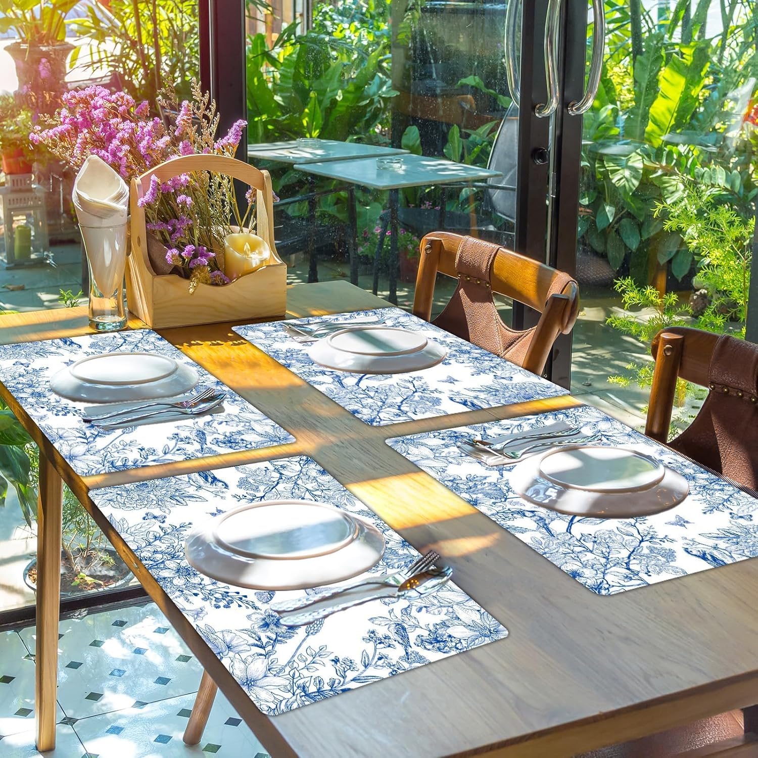 Blue Floral Placemats Set of 6 Flower Bird Plastic Table Mats Seasonal Spring Placemats Chinoiserie Place Mats Rustic Vintage Table Decoration for Indoor Outdoor Party Kitchen Dining
