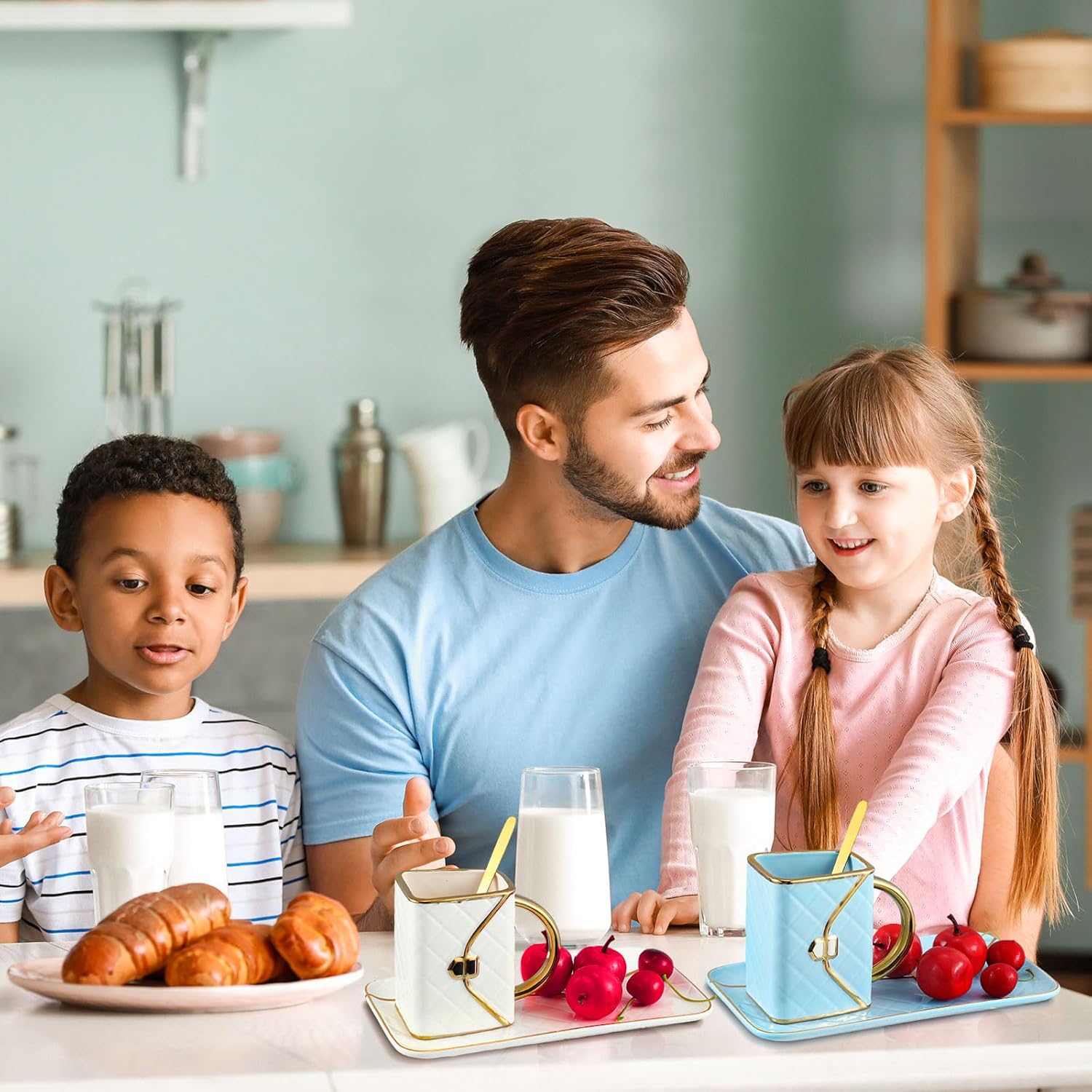 Zubebe 2 Sets Coffee Mug Elegant Handbag Shaped Cup Modern Ceramic Purse Mug with Spoon and Saucer, 10oz Cute Creative Tea Cup for Office Home Woman Girls Gift (White,Blue)