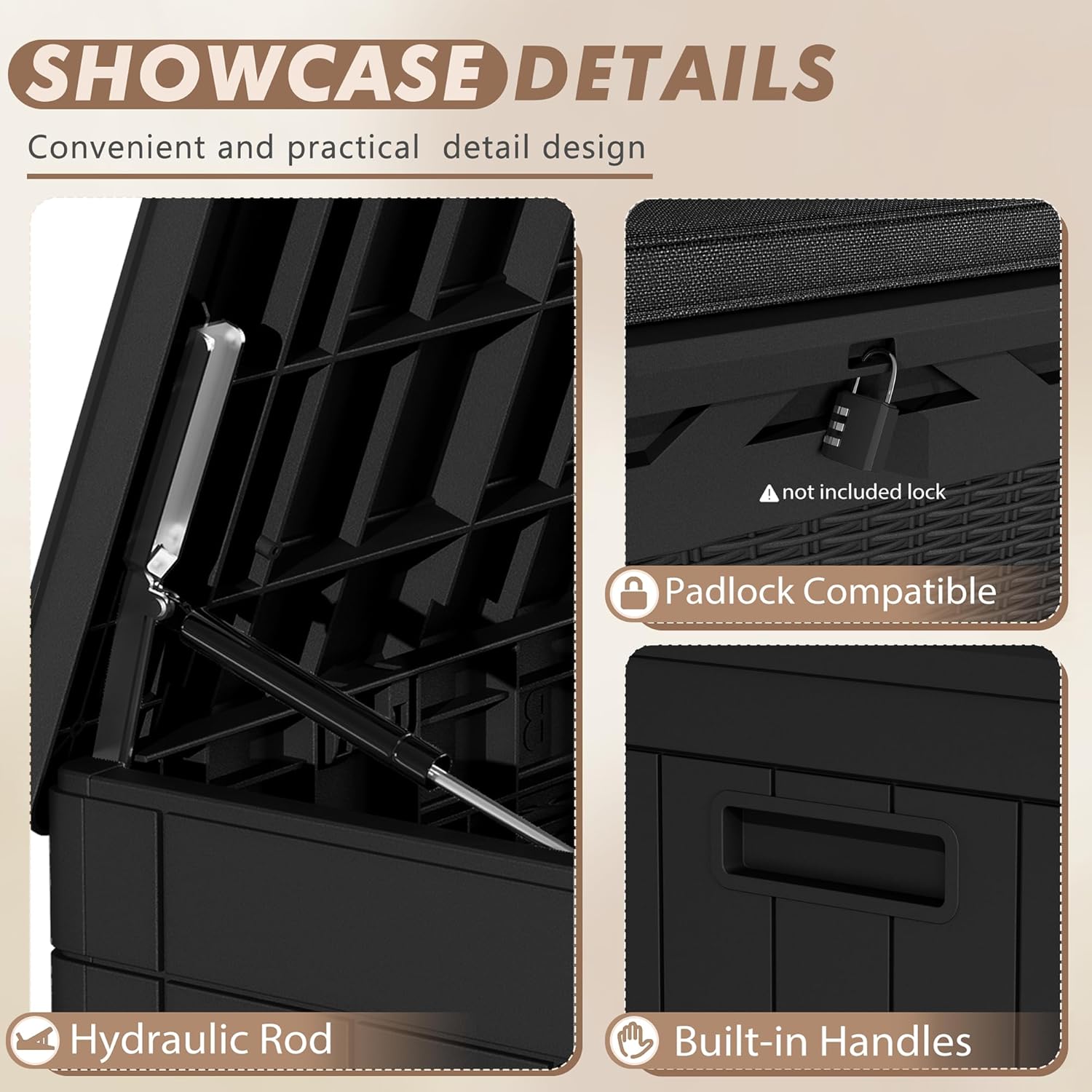 - Durable Resin Material: Deck box is made of waterproof resin, with a complementing rattan pattern design, effectively preventing fading and rusting, while also maintaining a fresh appearance even with all-weather use