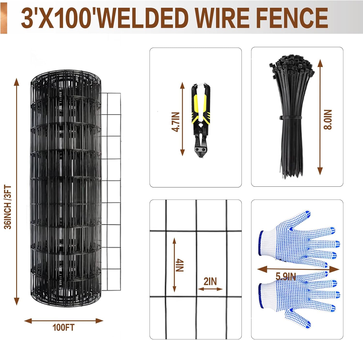 - Welded Wire Mesh Roll: This welded wire fence size is 3 ft x 100 ft and comes in a roll format, allowing you to customize its length according to your specific needs. Whether you need a short section for a small flower bed or a longer stretch to enclose an entire yard, the flexible nature of this welded wire mesh roll ensures a seamless and professional-looking installation.