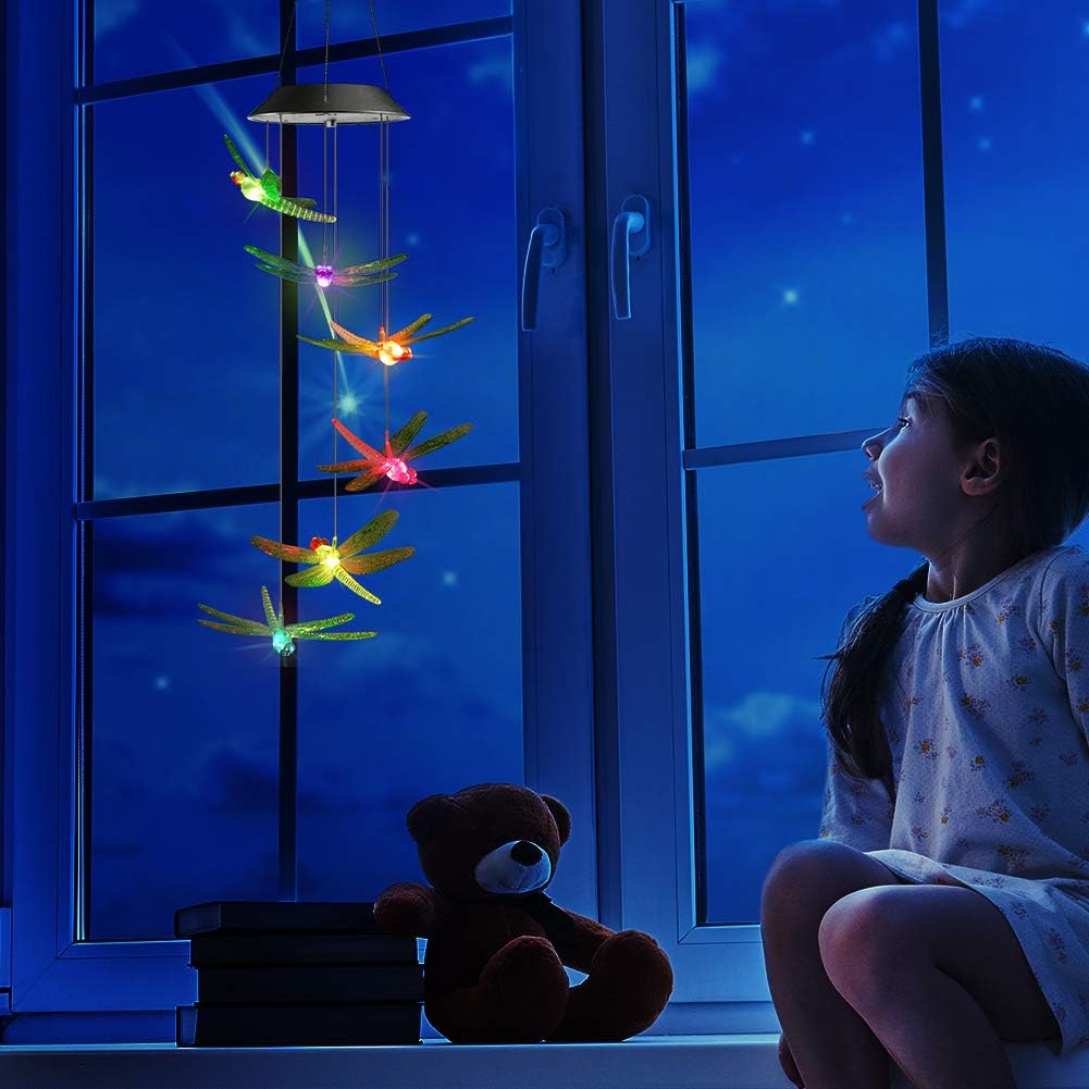 - 【Top Gift Idea】This lovely solar wind chimes will give a surprise to your friends and families. Top gift choice for birthday, mother day, Thanksgiving, Christmas, Memorial day. Color changing LED dragonfly will make livable, enjoyable atmosphere. If any problems, please feel free to contact us via Amazon e-mail box.