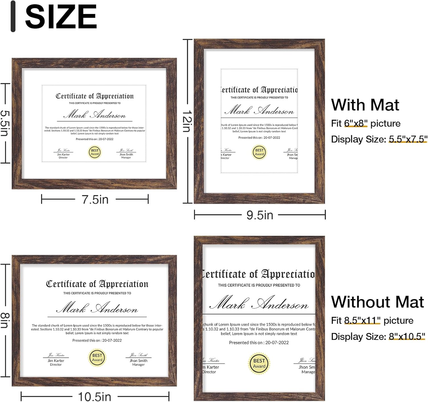 Vittanly 8.5x11 Picture Frames Set of 9, Shatter Resistant Plexiglass, Display 6x8 Pictures with Mat or 8.5x11 without Mat, Photo Frames for Wall or Tabletop, Engineered Wood, Brown