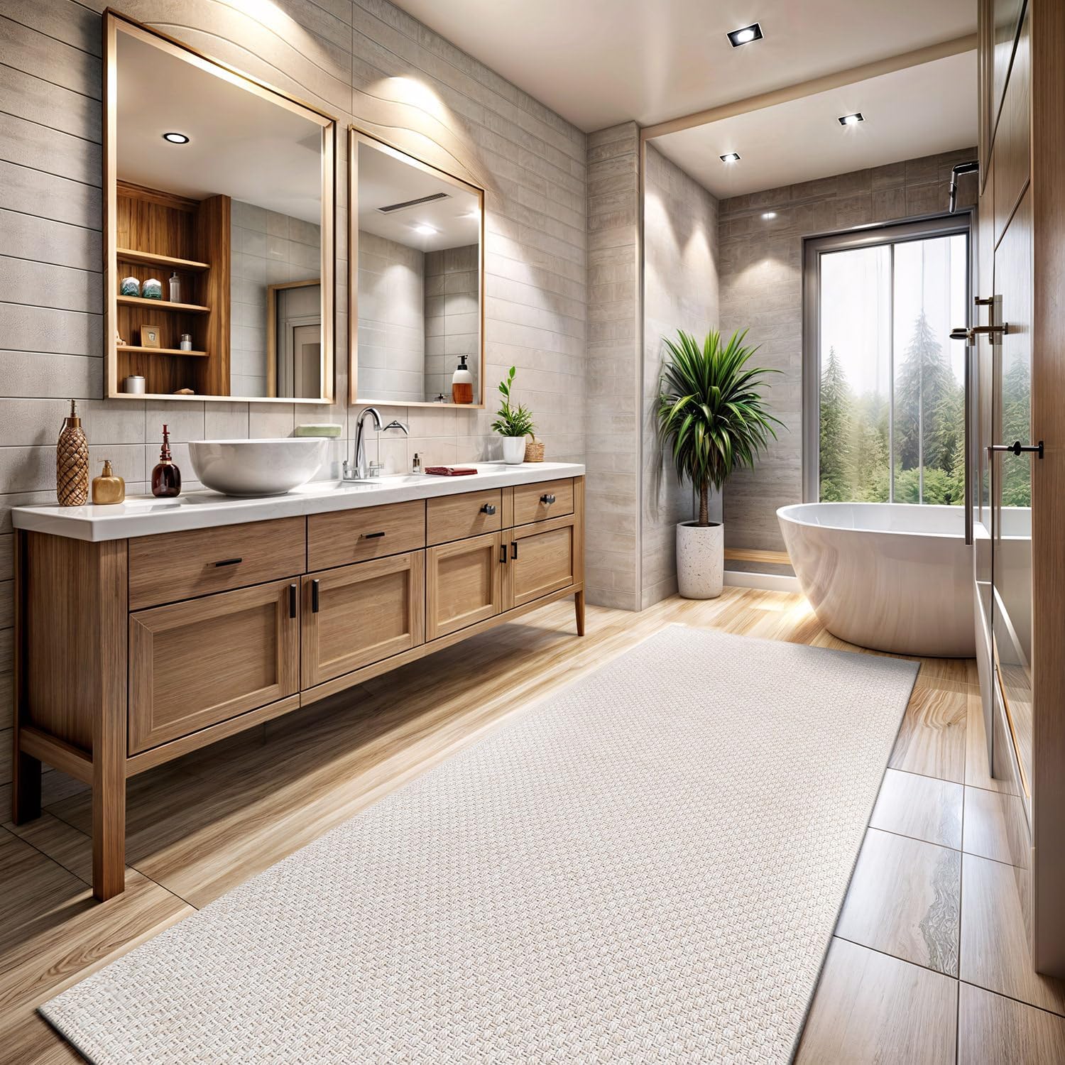 CAMILSON Indoor and Outdoor Runner Rug Off-White Solid Woven Design Easy-Cleaning Non Shedding Farmhouse Living Room Bedroom Garden Patio and Kitchen Washable Outside Carpet Alfombras (2x7)