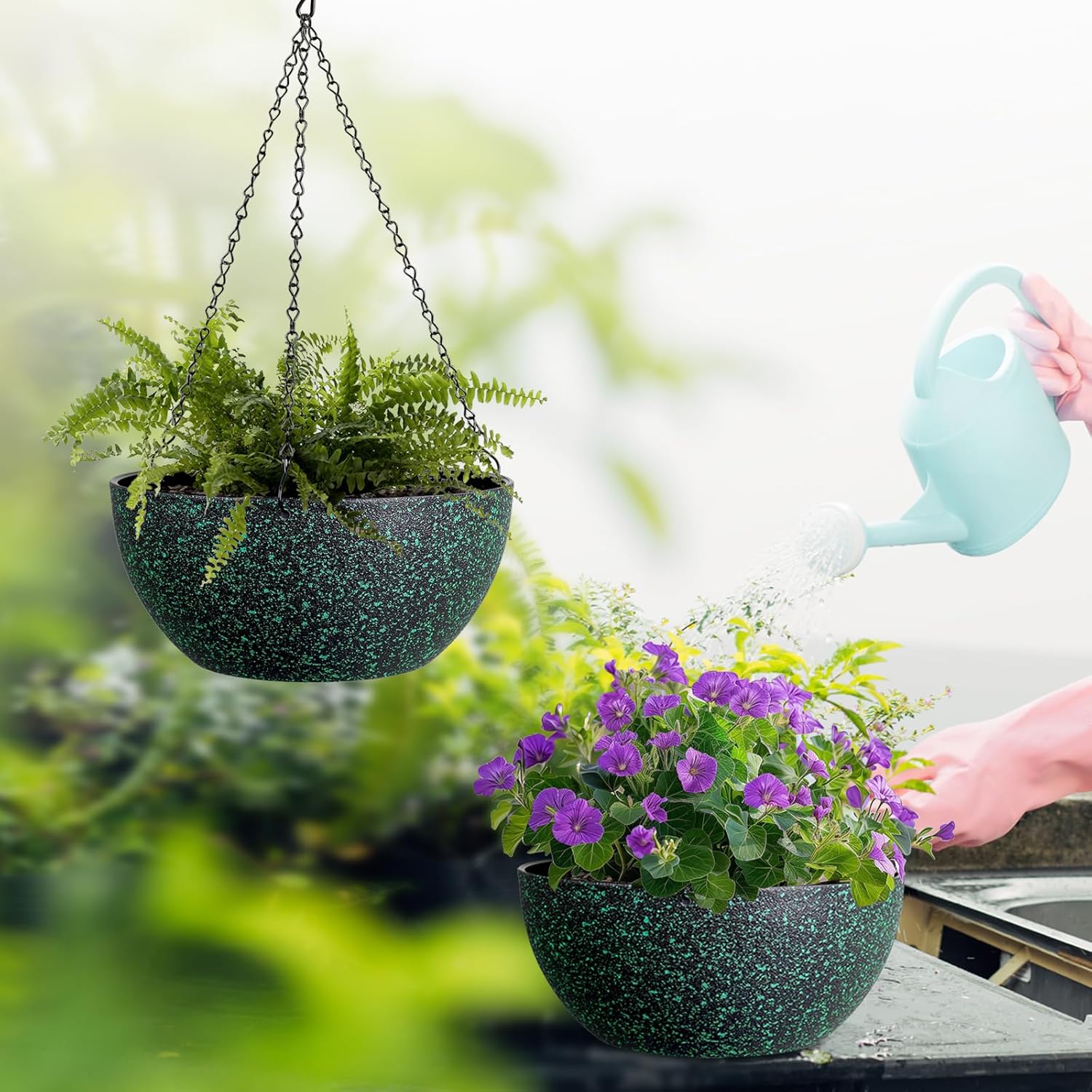 13inch Large Hanging Planters Pots for Outdoor Indoor Plants with Drainage Holes and Chain, 2pack Round Hanging Flower Pots for Garden Home Porch Decor, Black with Green Speckles