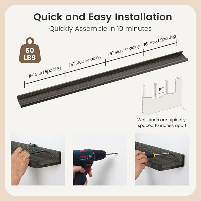 - Easy to Install: You will get a level, screws for the wall, drywall anchors, a detailed installation guide, and two beautiful hand-crafted solid pine wood shelves. With the level, you can make sure your picture ledge shelves are well aligned. Just follow the simple instruction to install the hanging shelves for wall decor within 10 minutes. We add additional screw and anchor to the hardware bag just in case. If you have any questions about our products, please feel free to contact us