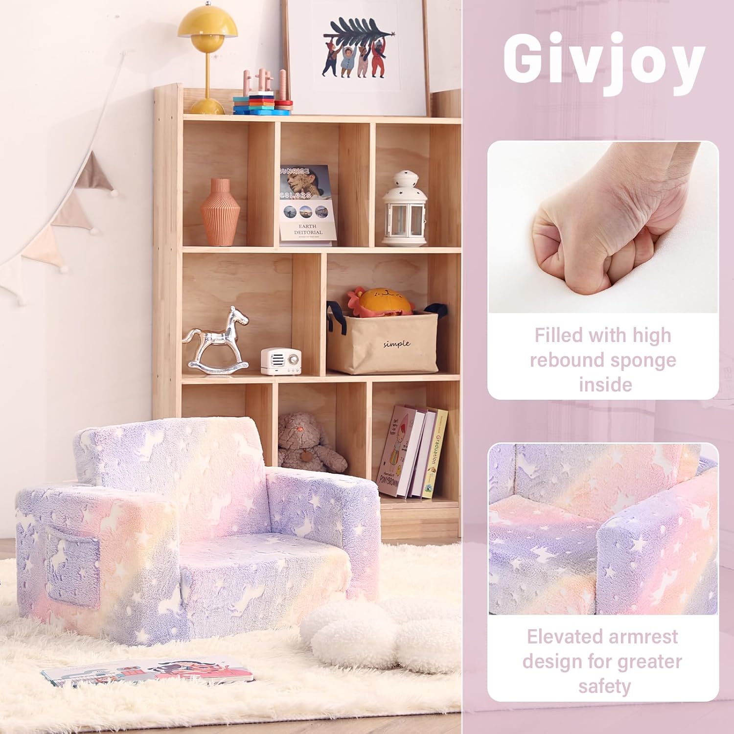 Toddler Chair Kids Couch, 2-in-1 Toddler Soft Sherpa Couch Fold Out Armchair with Removable Cover, Convertible Reading Chair Toddler Sofa for Kids, Glow in The Dark Purple Horse