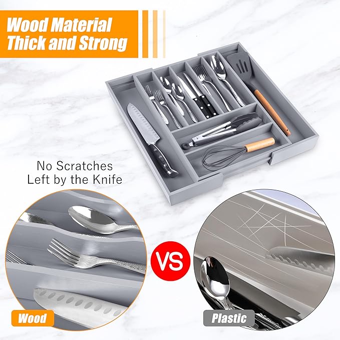 - ✅【Quality - Deep Compartments & Reinforced Base】Our utensil drawer organizer features compartments with a depth of 1.9 inches, helping maximize drawer space and perfect for storing more essential tools and gadgets. The utensil silverware drawer organizer comes with a reinforced base, ensuring durability for long-term use, and is ideal for supporting the weight of heavy-duty utensils and knives. Keep everything you need conveniently at hand while cooking, neatly visible, and easy to grasp when preparing the next meal in the kitchen.