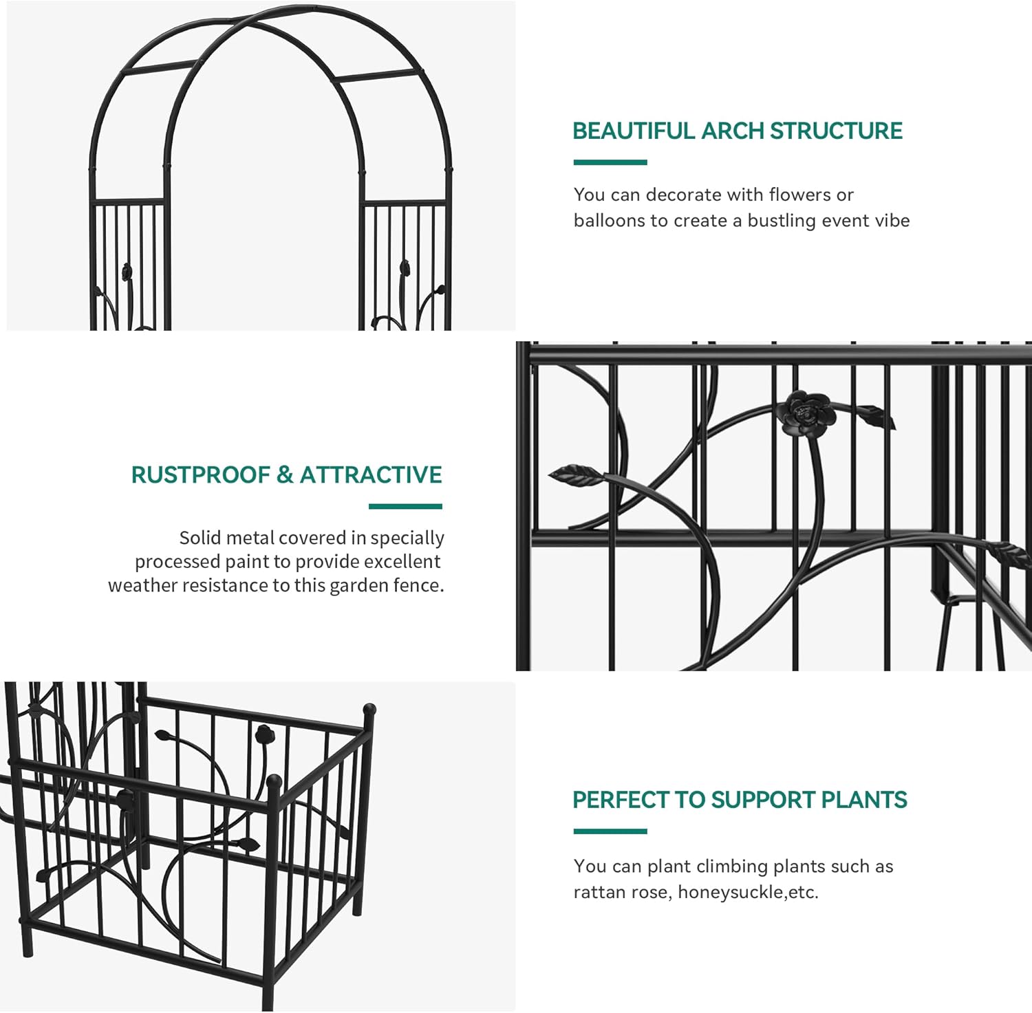 - Durable & Stable: Sturdy steel tubing is treated with weather-resistant black epoxy to ensure stability and prolonged outdoor use; The reinforced supporting frame at the bottom features ground stakes so that the garden arch can withstand weather elements.