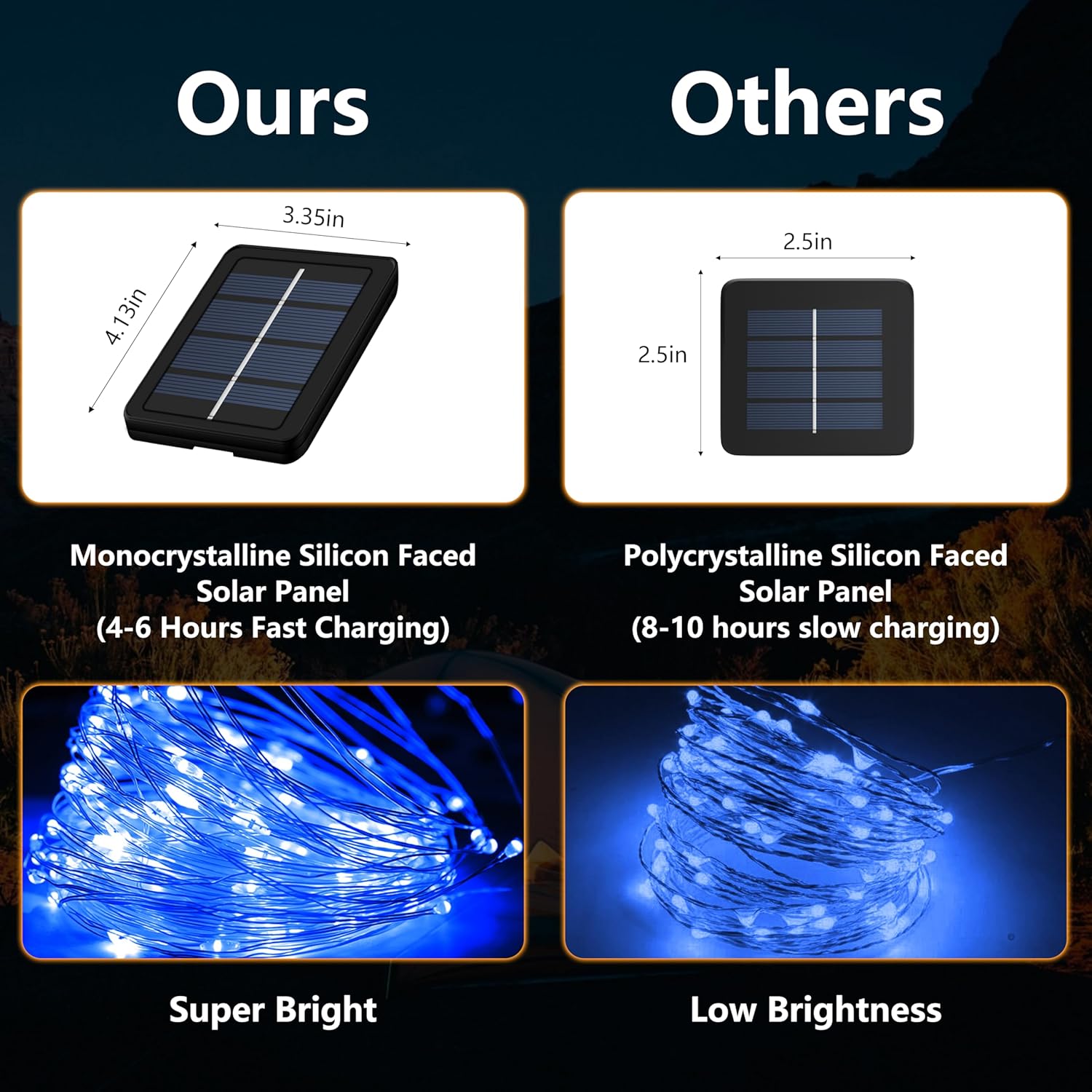 - [2023 NEW UPGRADED LIGHT SENSOR] -- Starlight solar string lights use the latest bulb technology, which enlarges the light beads and also reduces power consumption. It also uses more advanced monocrystalline silicon solar panels that can receive and store the sun's energy and then release it efficiently. Whether it rains, sunsets or snows, all modules are IP65 waterproof, making them suitable for indoor and outdoor use without fear damage (canno be submersion in water).