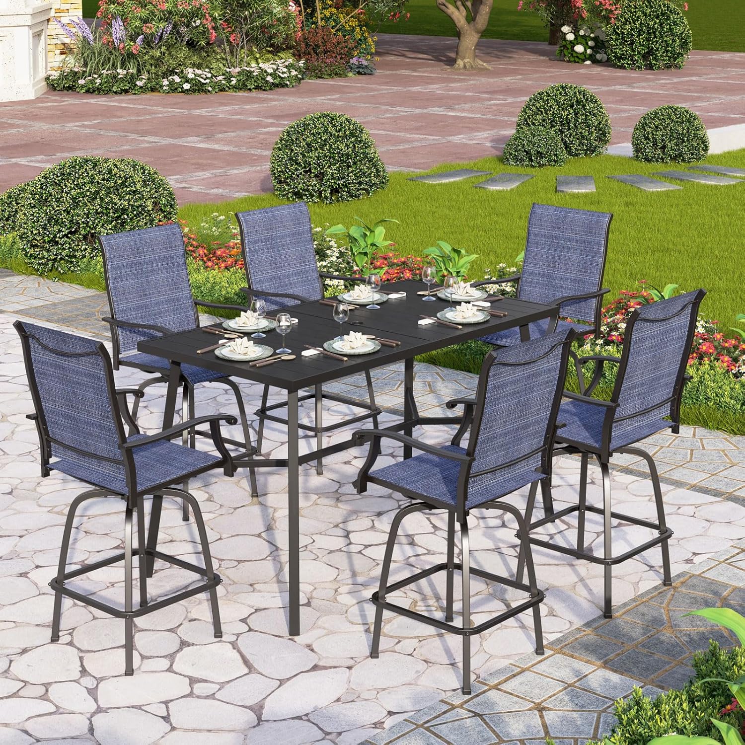 PHI VILLA Outdoor Bar Set, 7 Piece Patio Dining Table and Swivel Bar Stools with Metal Table, for Garden, Pool, Yard and Terrace
