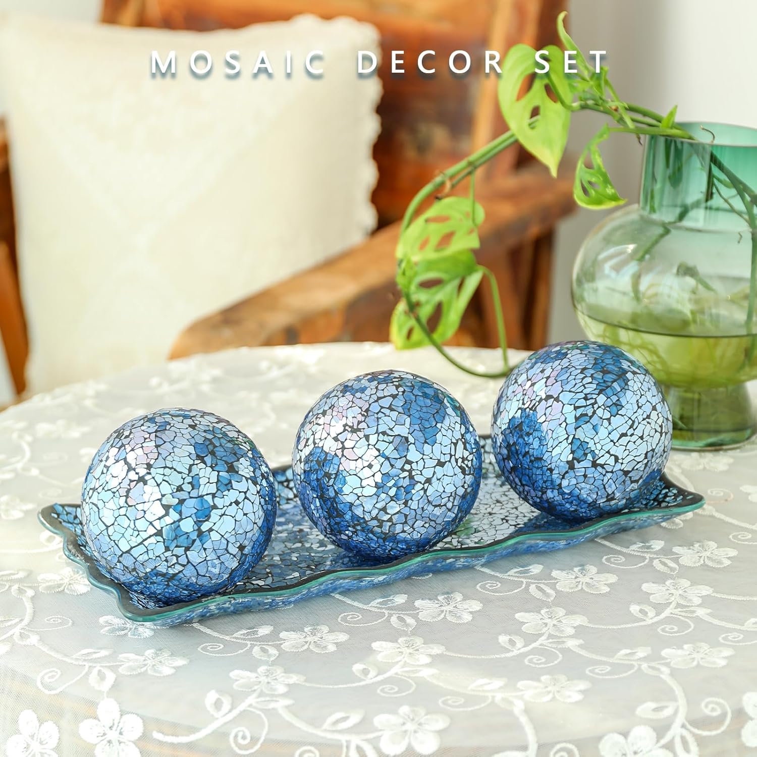 - Centerpiece Table Decorations: The glass decoration ball is mosaic style, adorned with blue glass pieces resembling cracked sequins. These orbs sparkle in the light and make elegant table accents. Perfect for enhancing your table setting