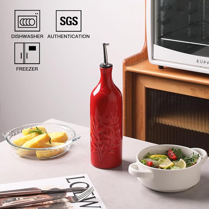 Sweejar Large Ceramic Olive Oil Dispenser Bottle, 24 Oz Relief Opaque Oil Cruet Protects Oil To Reduce Oxidation, Storage Vinegar, Soy Sauce, Coffee Syrup, Liquids, Set of 1 (Red)