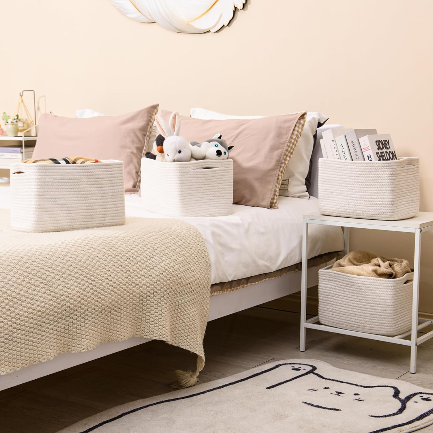 - MULTIPURPOSE CUBE STORAGE BASKETS: Ready to display and organize your desks and tables, racks, shelves, dressers, and closets while adding a nice touch to your home decor?Use the ICERZCZ small storage baskets can make your home more tidy. Designed to fit on shelves, in closets, and even under beds, these cotton rope baskets are ideal for organizing your home or office