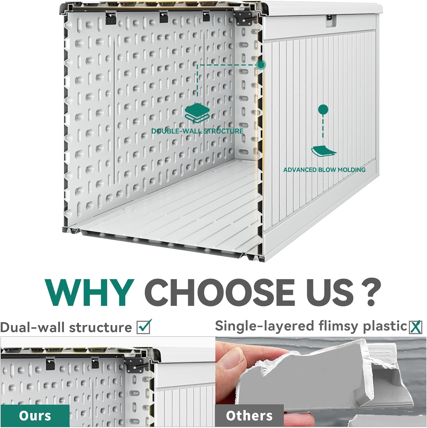 - Double-Layer Structure: Our all-weather resin deck box stands out with a double-layer structure and enhanced with internal reinforced steel beams, providing durability and resilience for outdoor use