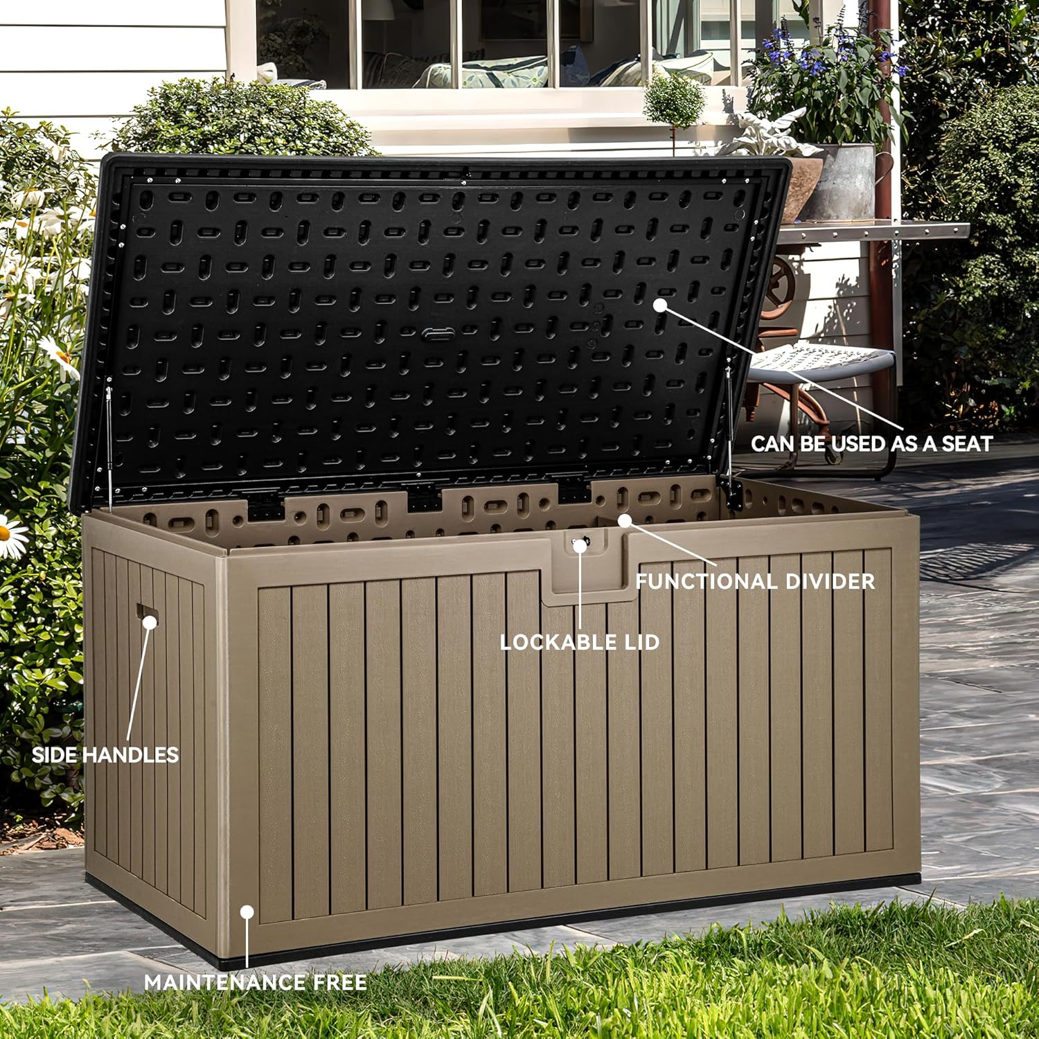 - Versatile Design: The large deck box features a built-in divider and two matching slots for classified storage; Upgraded gas strut design ensures smooth operation, while convenient side handles make movement easy; A lockable lid offers secure storage
