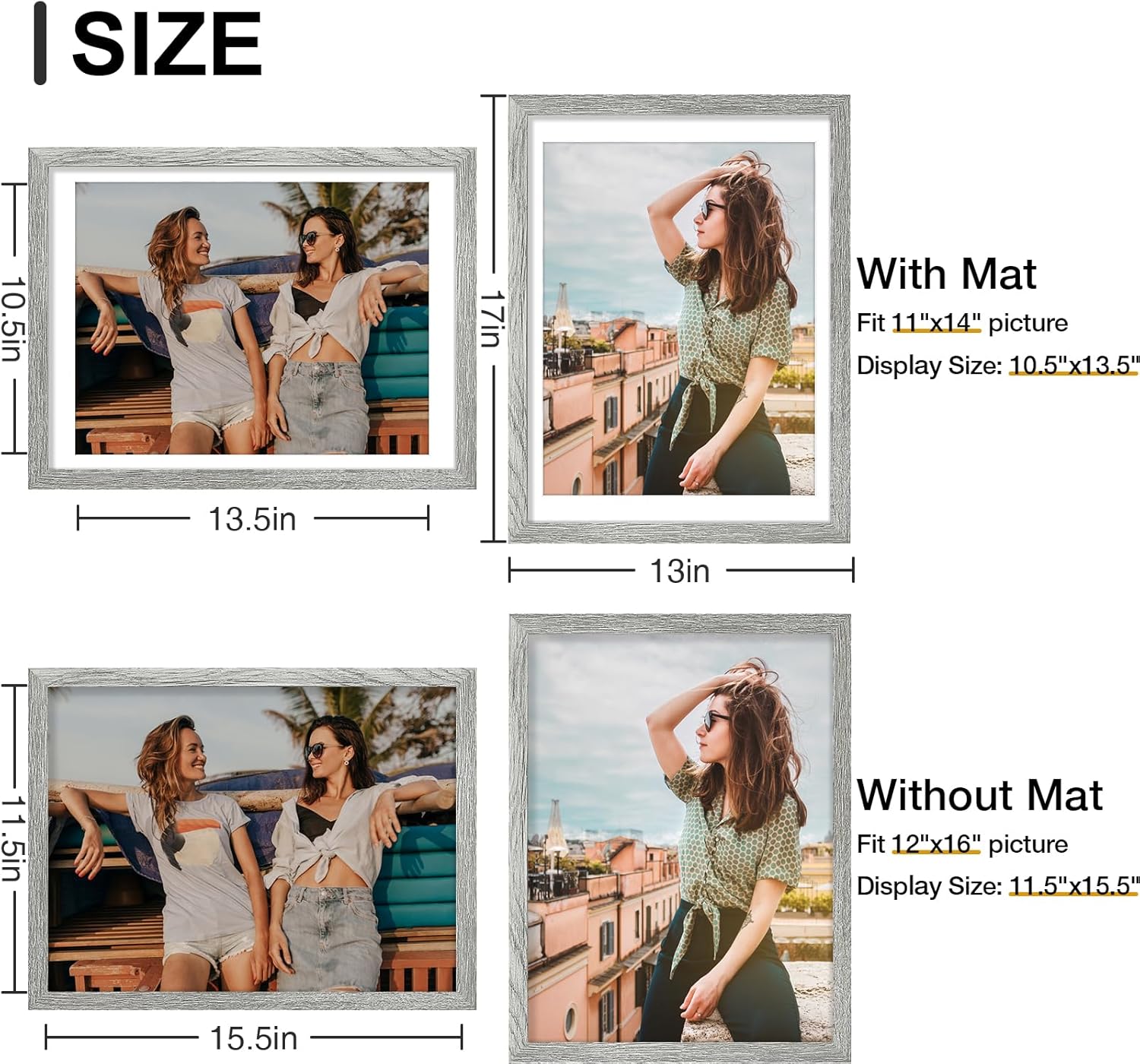 - Size: Each set includes nine 12x16 frames with white mats for 11x14 photos, or without the mat for 12x16 pictures. The frames are 0.78 inches wide and 0.5 inches thick. The opening of the frame and mat is slightly smaller than the picture itself