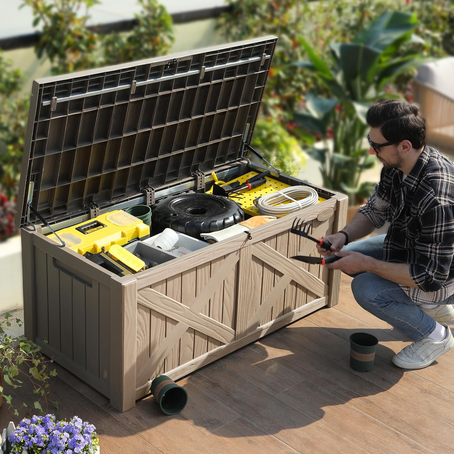 - LARGE STORAGE SPACE- 120-gallon capacity results in a roomy storage solution for your garden tools, pool supplies, sporting equipment, etc., on patio, deck, or porch