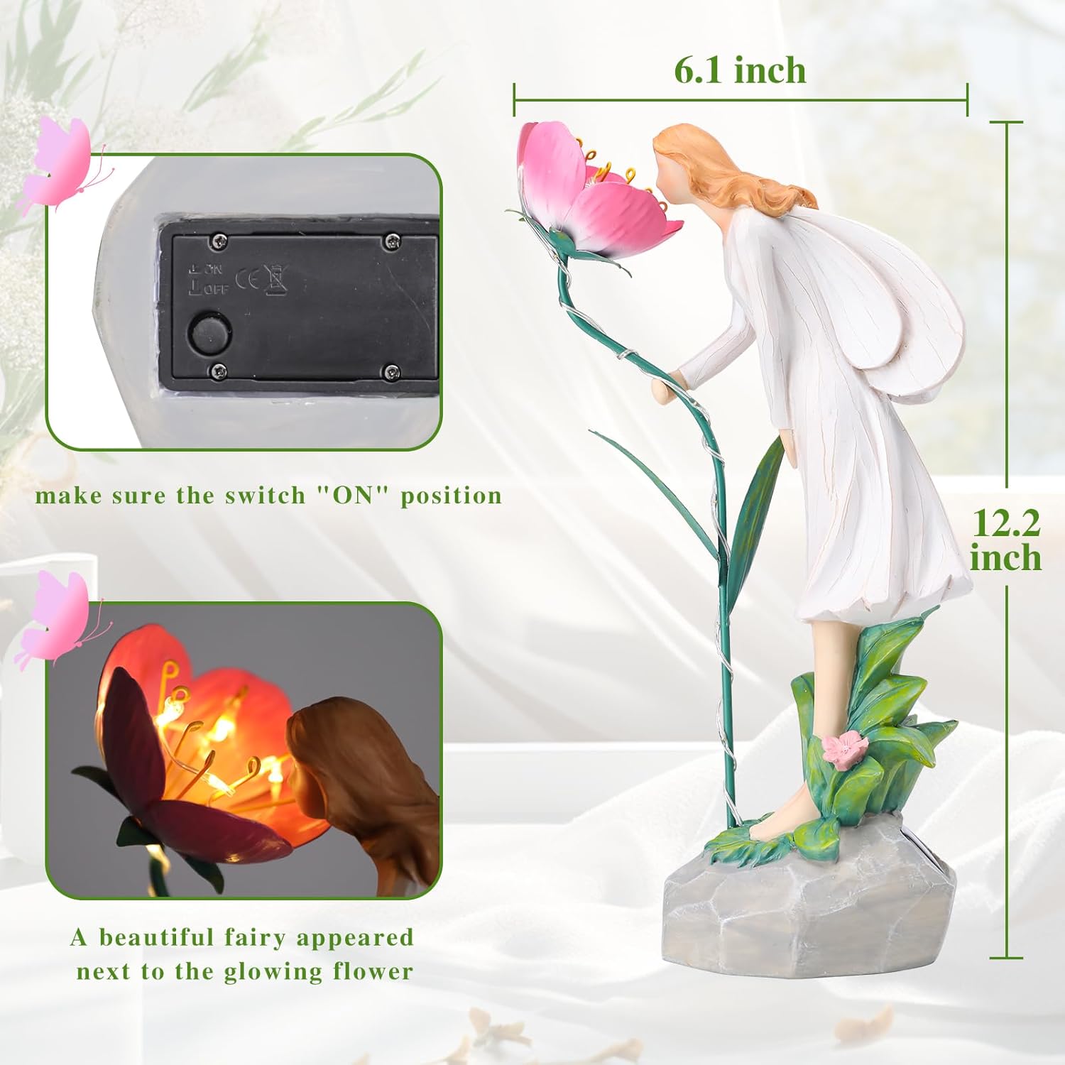 - 【Easy To Use】Just press the switch to the "ON" position, place the fairy garden sculptures under direct sunlight, this fairy statues converted solar into electricity to light up auto at night in your yard.