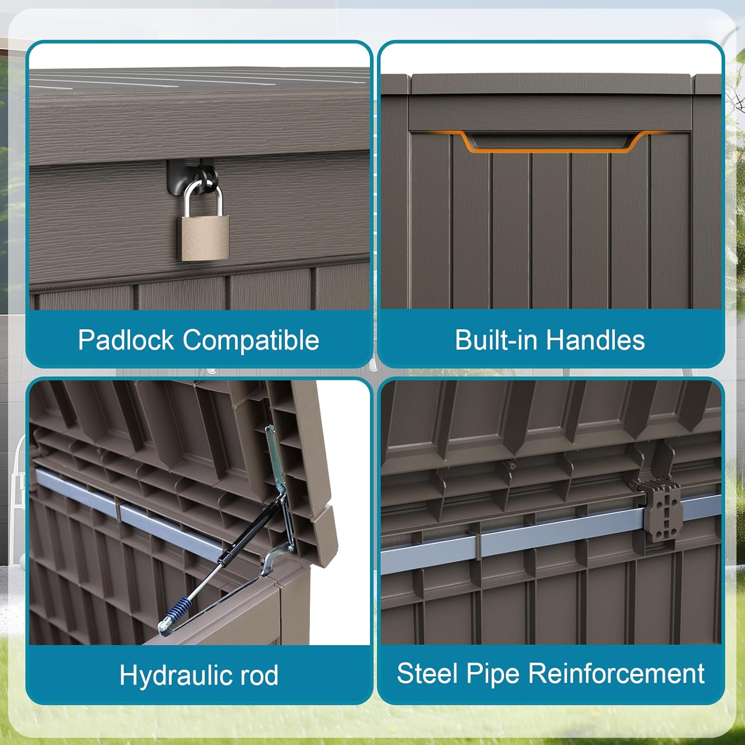 - Safety design: Each deck box has lockable holes (not included) for added security; in addition, the box is equipped with a hydraulic stand, which allows easy opening and slow closing and prevents hand pinching. The outdoor waterproof deck box has built-in handles on both sides, ensuring easy grabbing and moving.