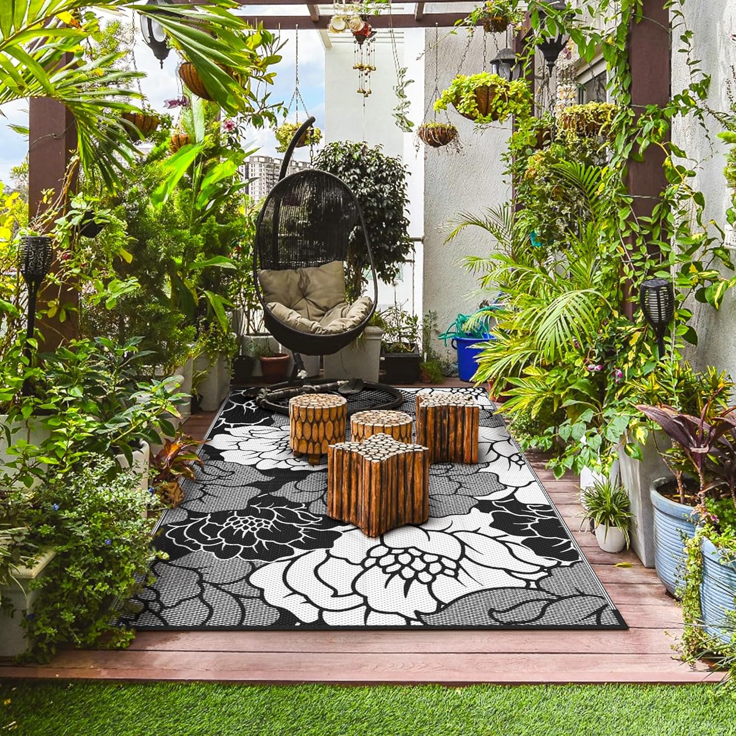 GENIMO Outdoor Rug Waterproof for Patio Decor, 8' x 10' Reversible Plastic Straw Floral Camping Carpet, Large Area Rugs Mats for RV, Camper, Deck, Balcony, Porch, Beach, Picnic, Mix-Black & White