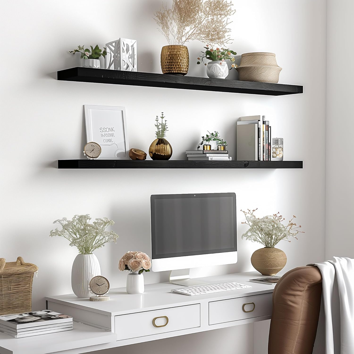 Wood Floating Shelves for Wall Decor, Rustic Wall Shelves for Bedroom Bathroom Kitchen Living Room, Set of 4 Black 48 Inch