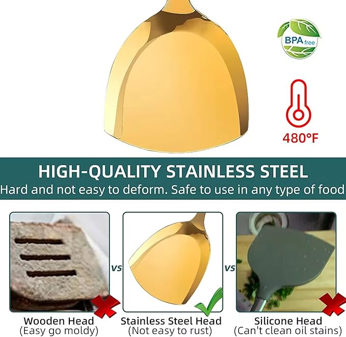 Generic Stainless Steel Kitchen Utensil Set, Spoon, Spatula, Pasta Server, Small Spatula (Green & Gold)