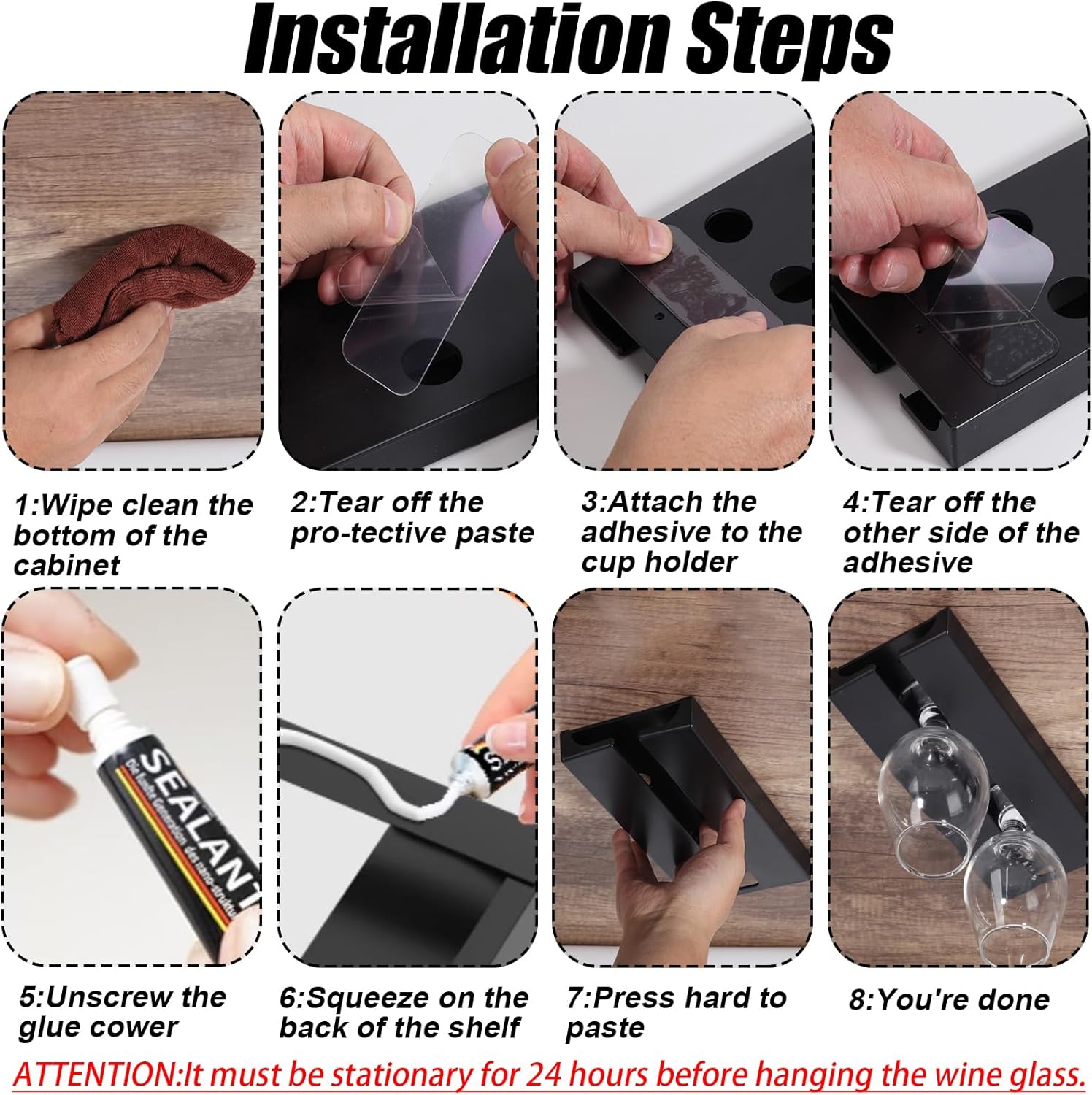 - EASY TO INSTALL: The wine glass rack is equipped with self-adhesive adhesive, Punch-free,easy to install,Due to the different materials of cabinets, Suitable for different installation environments:bar glass holder,wine cabinet,kitchen cabinet,under shelf in receiption room etc.