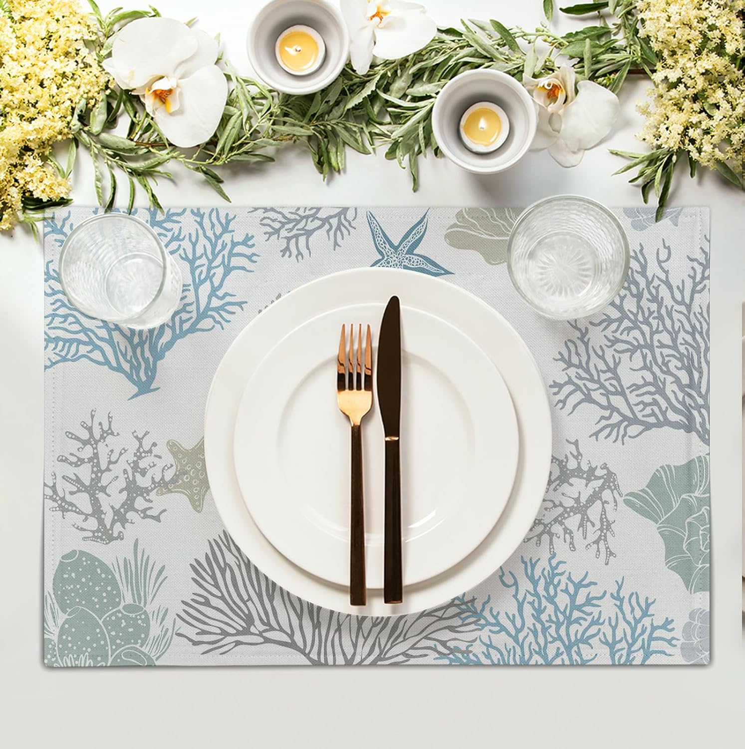Summer Linen Placemats Set of 4 Nautical Coastal Theme Washable Non-Slip Heat Resistant Table Place Mat 12×18 Inch Ocean Beach Blue Grey Coral Starfish Place Mats for Kitchen Dining Table