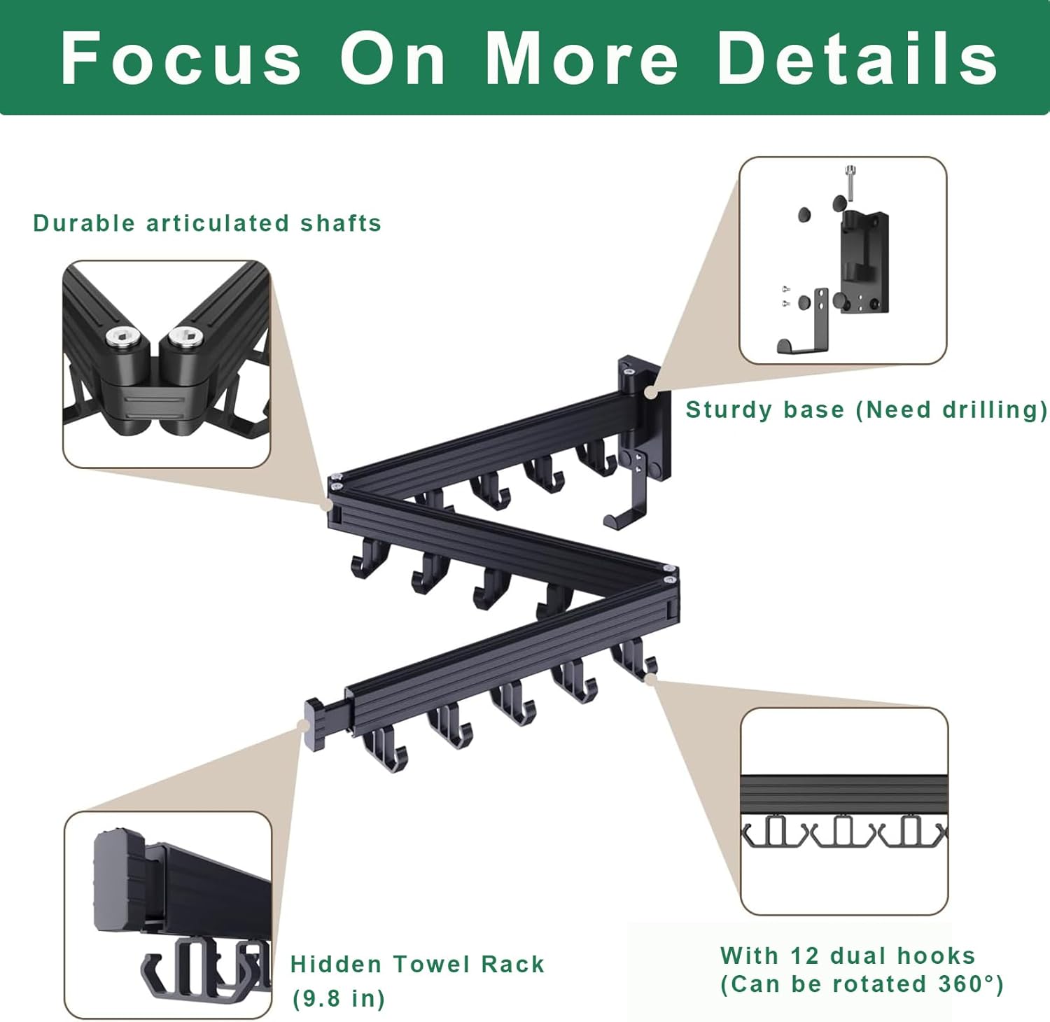 - ✅ Upgrade Dual-J-Shape Hooks Design -- Our clothes drying rack features an innovative design with 12 dual J-shaped & circular hooks, providing you with versatile hanging options. The additional large hooks and extendable rods make it easy to hang a variety of items with ease. Maybe you will fancy this wall-mounted clothes rack, as it brings convenience and efficiency to your daily life.