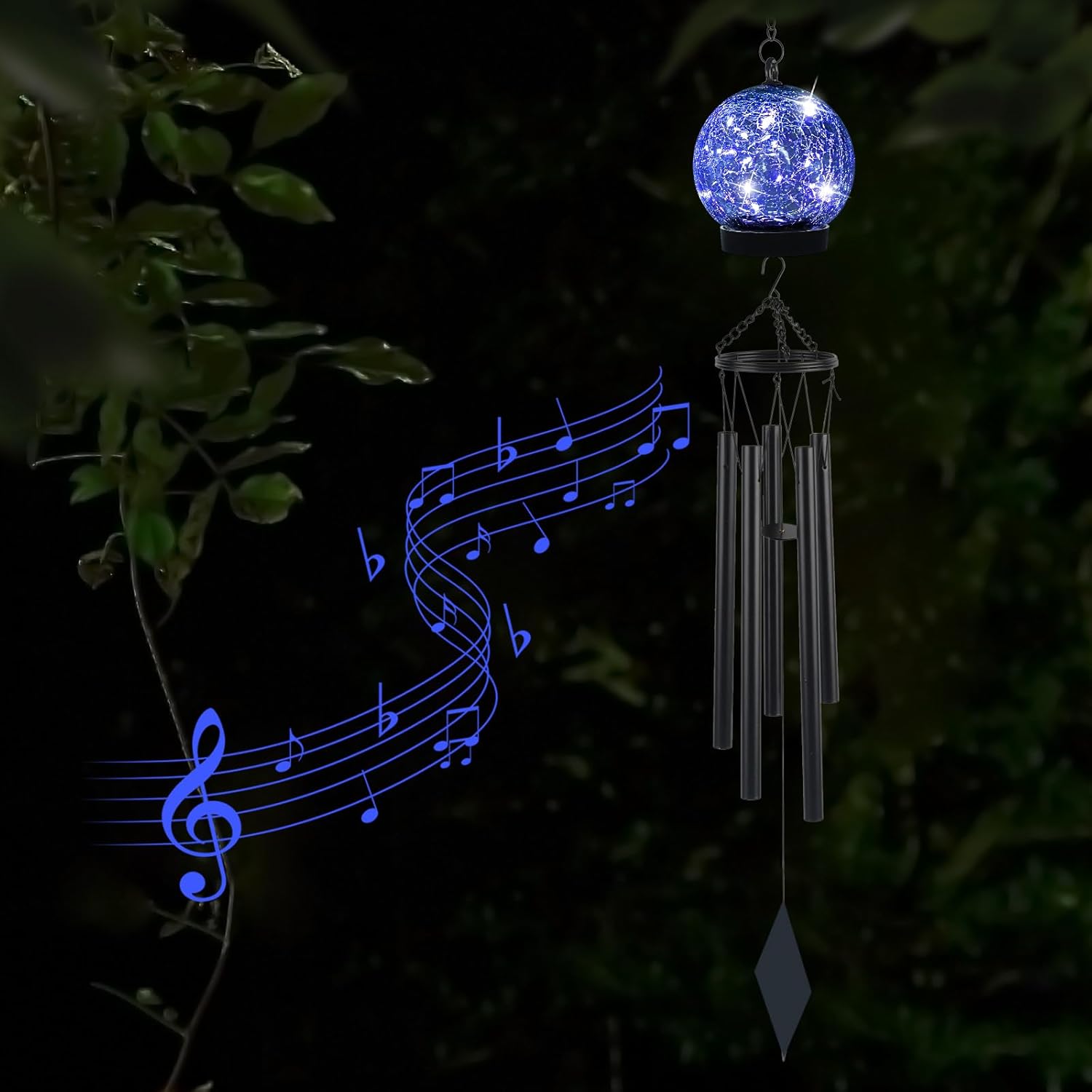 - 【Excellent Design】Elegant wind chimes with crackle glass globes, Each metal tube has sleek clean line. Solar wind chimes will shine in sunlight and like blue fairy in night. Creating a happy atmosphere and enjoying the beautiful windchimes in Garden.