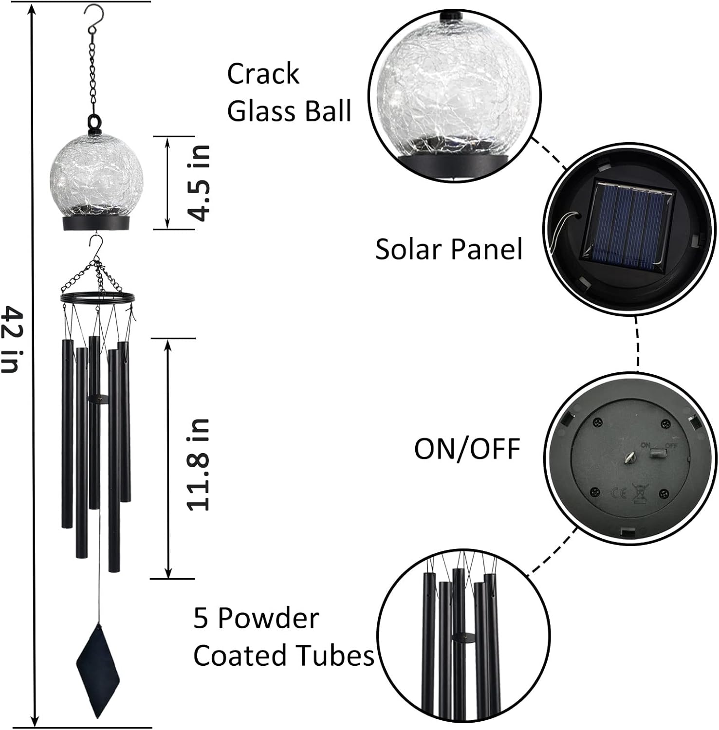 - 【Just The Right Size】: The length of large wind chimes are 42 inches from the top hook to the bottom pendant. The 5 tubes of Windchimes in the center pinned down from 8.7 inches to 11.8 inches. Prefect garden decor can match different family adornment style.
