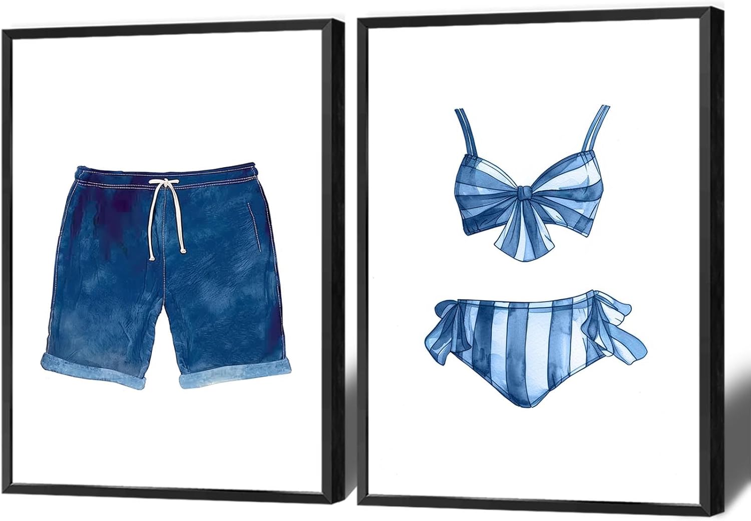 Liyark Set of 2 Retro Navy Blue And White Swimsuit Art Posters Beach Bathing Suit Prints Painting Beach House Wall Art Coastal Wall Decor Pictures For Bathroom Home Decoration 12x16in Framed