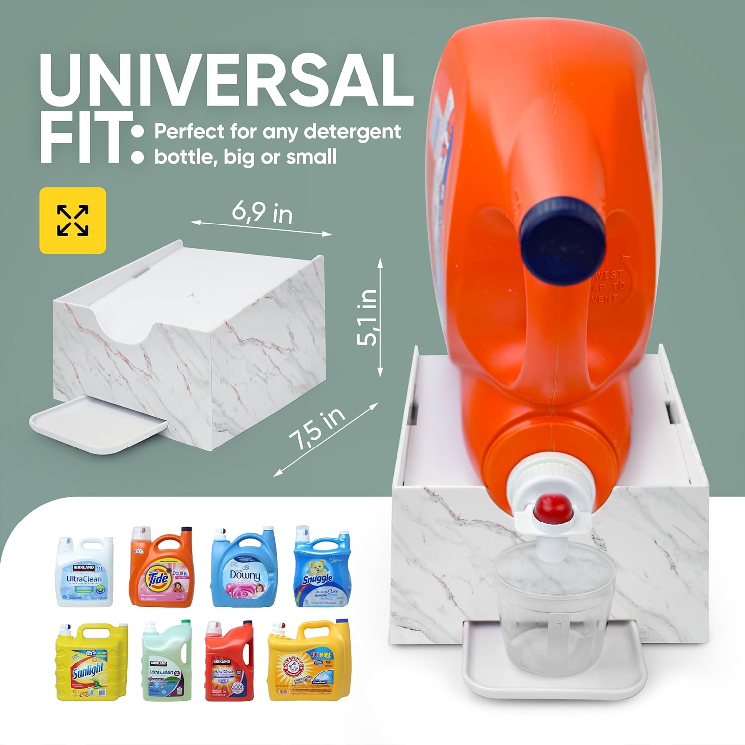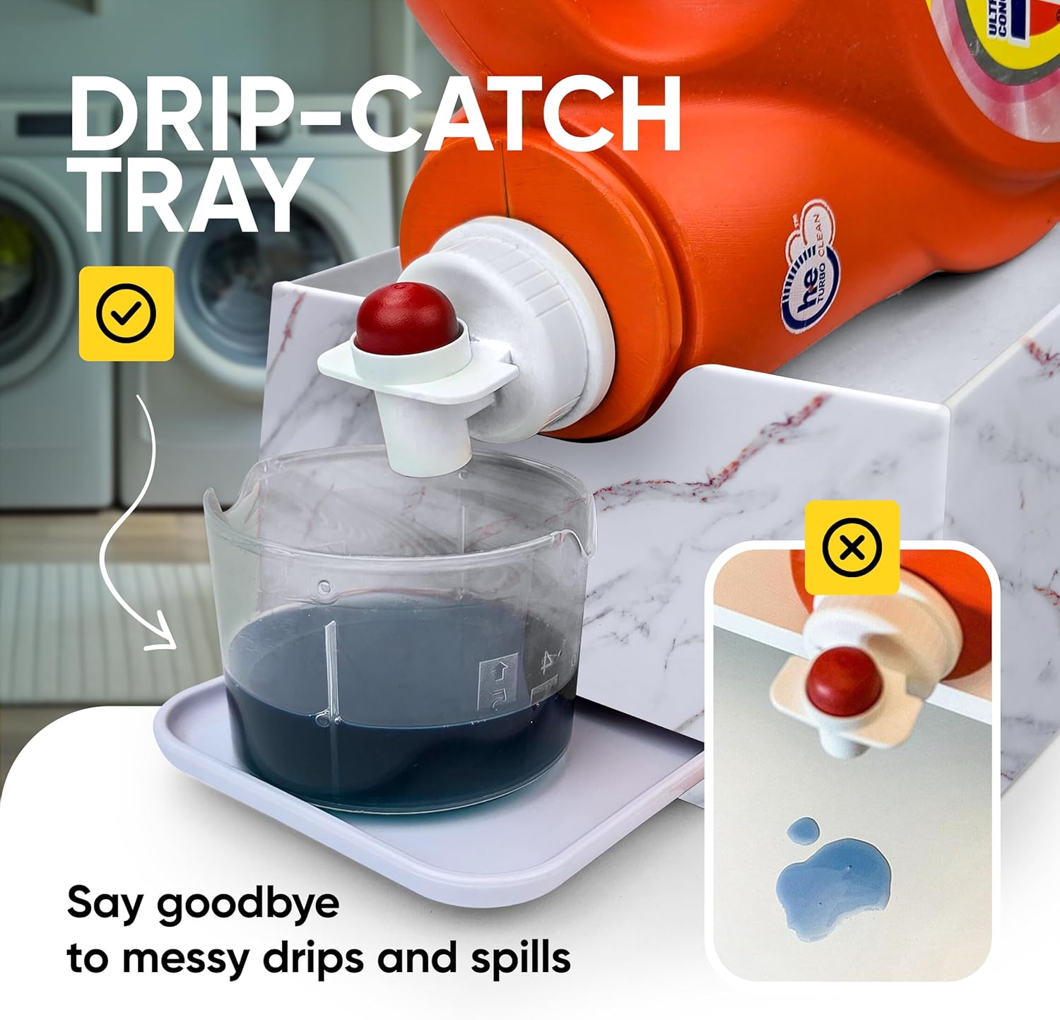 - Patents Pending Angled laundry detergent drip catcher, no need to tilt or lift the bottle. Downward slope makes soap pour out easily