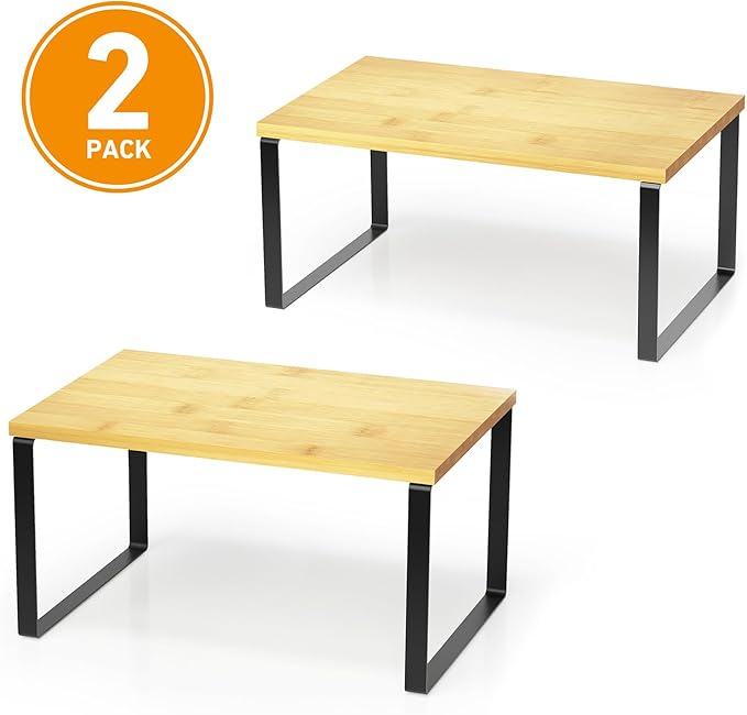 - BAMBOO SHELVES - With bamboo and metal combined, the cabinet organizer is perfect to utilize the vertical space; Also a great decorative addition or accent to any cupboard space